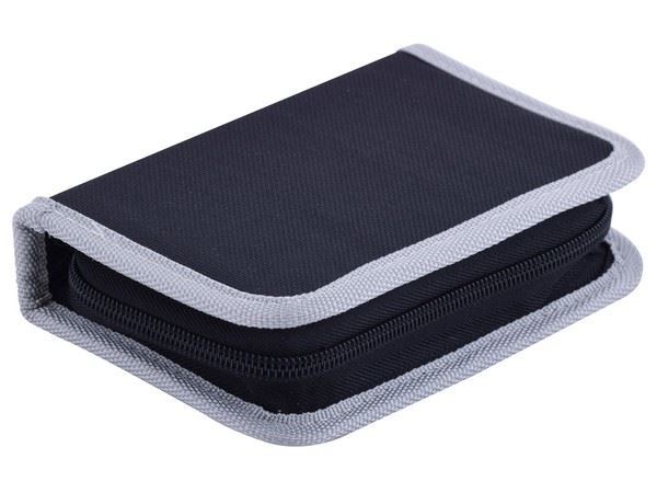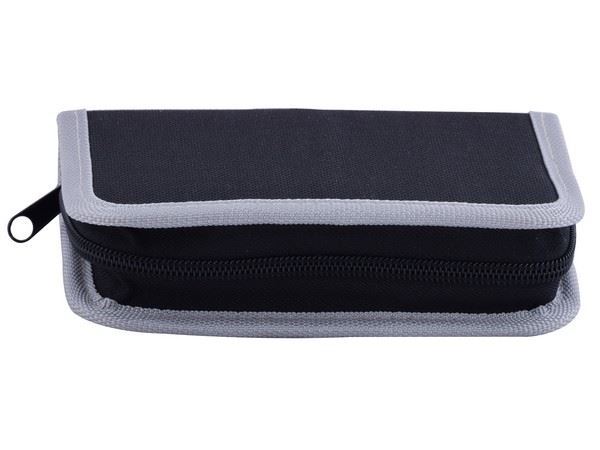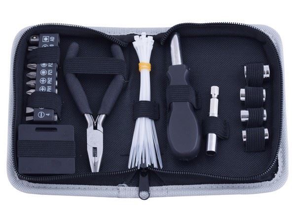 8-Piece Mini Tool Kit 18-Piece tool kit includes the most useful and necessary tools for home maintenance and daily use. It includes a long nose plier, cable ties, 10 driver bits, socket holder, 4 sockets and a level with tape measure. Includes a zip pouch to keep the tools secure, clean and organised Colour(s): Black-Grey Material: 600D Polyester Bag and Stainless Steel Tools Size:16.5 (l) x 9.9 (w) x 4.1 (d) - closed / 22.9 (l) 16.5 (w) x 4.1 (d) - open