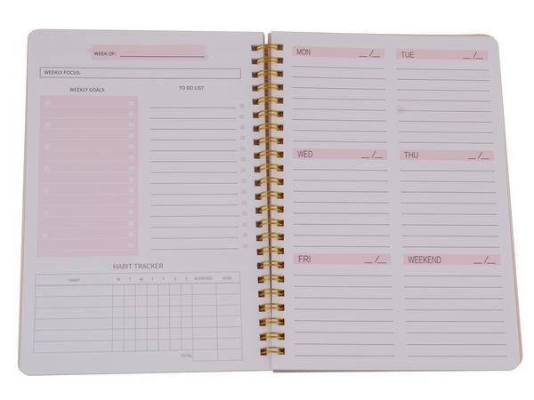 Stay organised with this elegant Weekly Planner. The non-dated weekly layout allows you to start planning at any time of the year without wasting pages. The 52 inner pages include space to add notes on days from Monday to the Weekend, weekly goals, to do list, and habit tracker. Comes with a gold spiral binding and inner 100g/gsm paper.