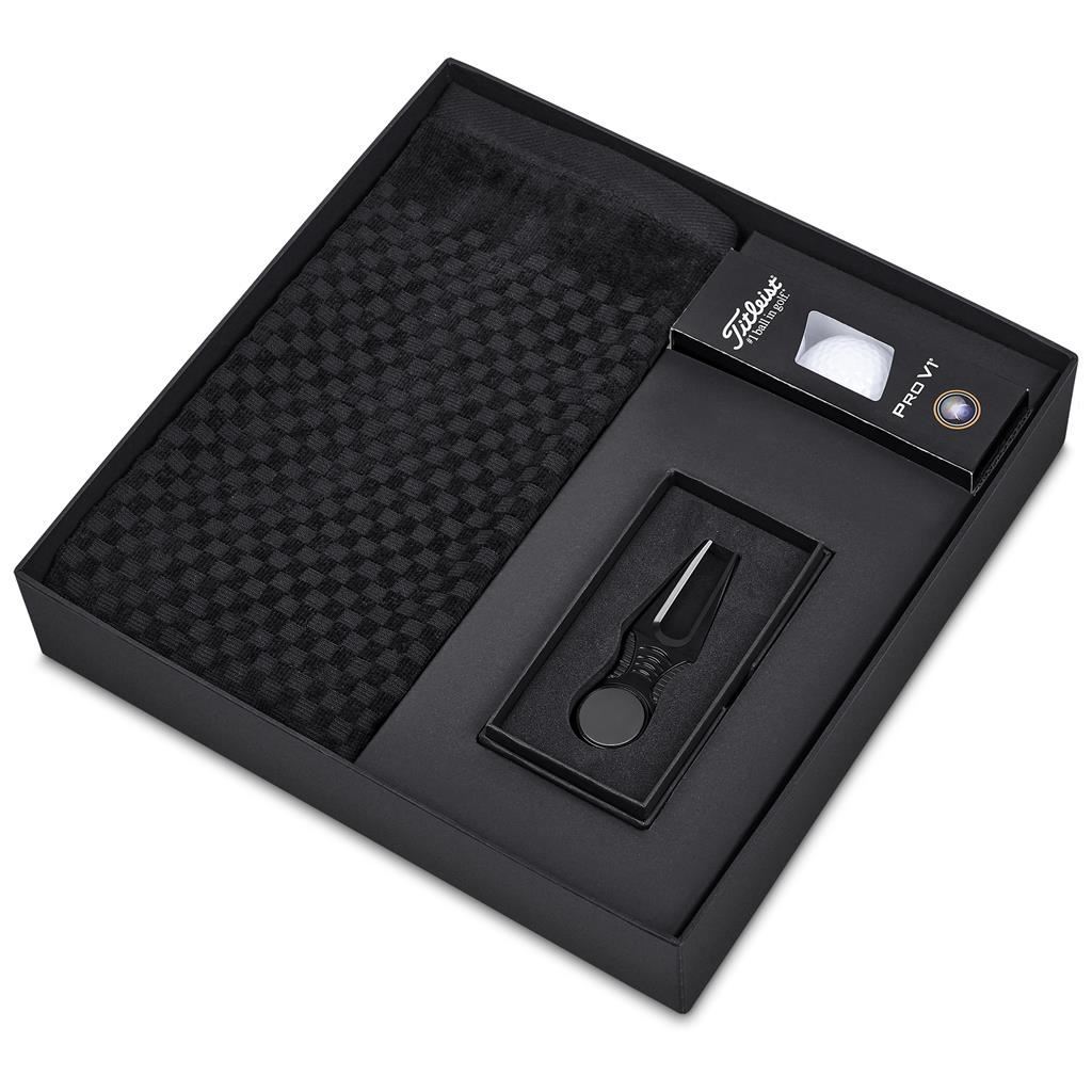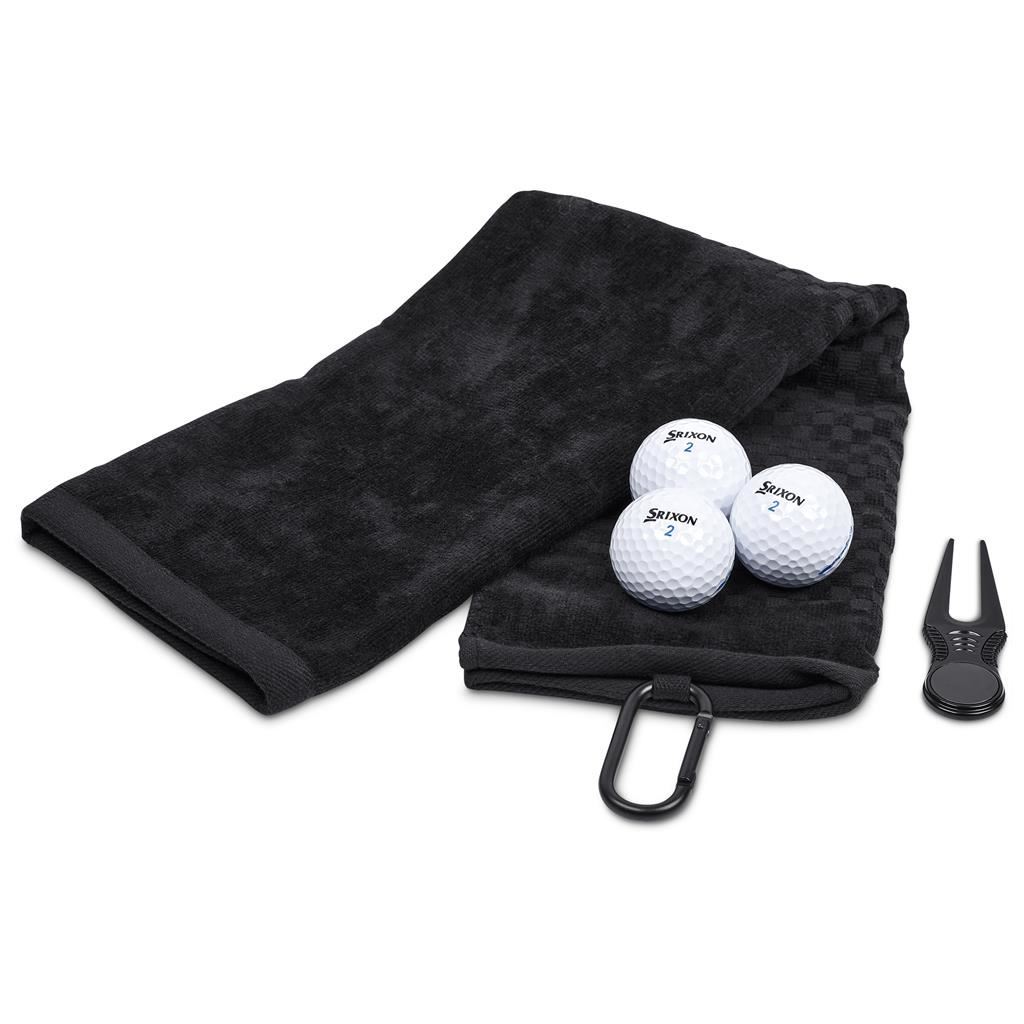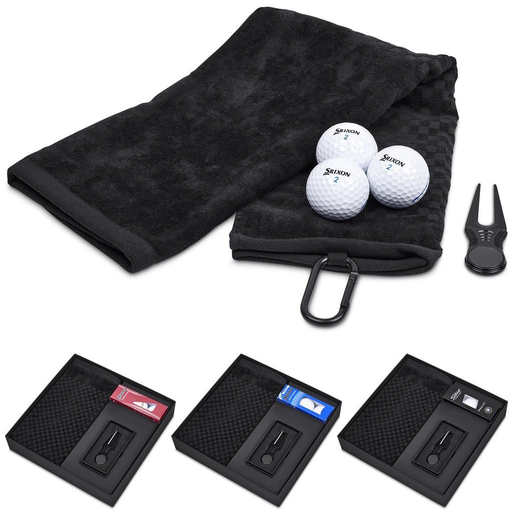 Alex Varga Calvert Golf Set This premium golf gift set is an ideal choice for corporate gifting and golf events. The set includes an Alex Varga cotton golf towel and a premium divot tool with a magnetic ball marker, presented in a two‑piece presentation box. Each set is completed with a sleeve of three golf balls, allowing the recipient to select the option best suited to their performance preferences and budget. A sophisticated and functional gift set designed to appeal to golfers of all levels while delivering excellent perceived value. The range is offered in a structured good, better, best pricing tier, providing a clear choice and flexibility: Good: Srixon Distance golf balls Better: Srixon AD333 golf balls Best: Titleist Pro V1 golf balls This gift set includes: Alex Varga Addy Medium Golf Box 28.5 ( l ) x 28.5 ( w ) x 4.5 ( h ) cm black two-piece box Alex Varga Arcadia Tri-Fold Golf Towel 56 ( l ) x 40 ( w ) cm 100% cotton 580g/m2 Alex Varga Baltusrol Divot Tool 9.5 ( l ) x 2.8 ( w ) cm stainless steel and zinc alloy built-in magnetic ball marker ridged sides for a comfortable grip Choice of Golf Balls: Srixon distance golf balls sleeve of 3 (SF-SR-94-B) Srixon AD333 golf balls sleeve of 3 (SF-SR-95-B) Titleist ProV1 golf balls sleeve of 3 (SF-TI-96-B) Starting price listed. Ball selection effects the price