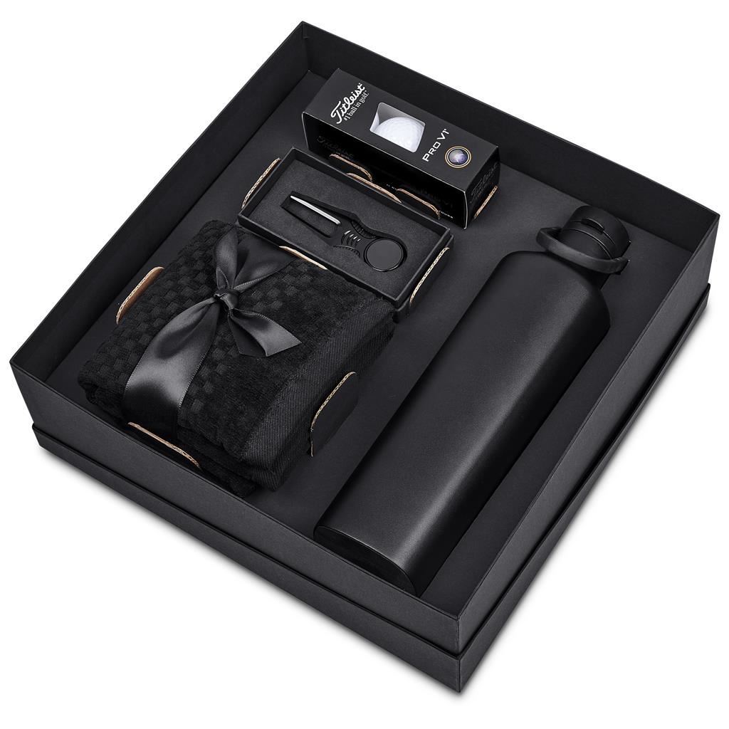 Alex Varga Royal Oaks Golf Set This premium golf gift set is an ideal choice for corporate gifting and golf events. The set includes an Alex Varga cotton golf towel, a premium divot tool with magnetic ball marker, and a double-walled water bottle, presented in a two‑piece presentation box. Each set includes a sleeve of three golf balls, allowing the recipient to choose the option best suited to their performance preferences and budget. A sophisticated and functional gift set designed to appeal to golfers of all levels while delivering excellent perceived value. The range is offered in a structured good, better, best pricing tier, providing a clear choice and flexibility: Good: Srixon Distance golf balls Better: Srixon AD333 golf balls Best: Titleist Pro V1 golf balls This gift set includes: Alex Varga Synchra Gift Box 32.5 ( l ) x 32.5 ( w ) x 11 ( h ) cm black two-piece box Alex Varga Arcadia Tri-Fold Golf Towel 56 ( l ) x 40 ( w ) cm 100% cotton 580g/m2 Alex Varga Valerian Stainless Steel Vacuum Water Bottle - 750ml 29 ( h ) cm stainless steel & plastic 750ml flip-top lid finger arch handle Alex Varga Baltusrol Divot Tool 9.5 ( l ) x 2.8 ( w ) cm stainless steel and zinc alloy built-in magnetic ball marker ridged sides for a comfortable grip Choice of Golf Balls: Srixon distance golf balls sleeve of 3 (SF-SR-94-B) Srixon AD333 golf balls sleeve of 3 (SF-SR-95-B) Titleist ProV1 golf balls sleeve of 3 (SF-TI-96-B) Starting price listed. Ball selection effects the price