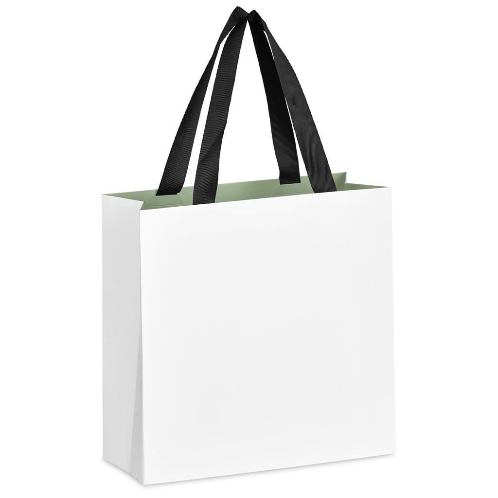 Altitude Galleria Mini Paper Gift Bag This small white gift bag, enhanced with contemporary colour inners, offers an elegant look and feel, making it a suitable choice for special occasions. A new design innovation eliminates the traditional back fold line, ensuring a seamless finish for a premium look. 24.5 ( l ) x 20 ( w ) x 24.5 ( h ) cm 230g/m2 art card & webbing matte finish white paper bag with colour inner black webbing handles paper bag without the fold line at the back panel bulk packed