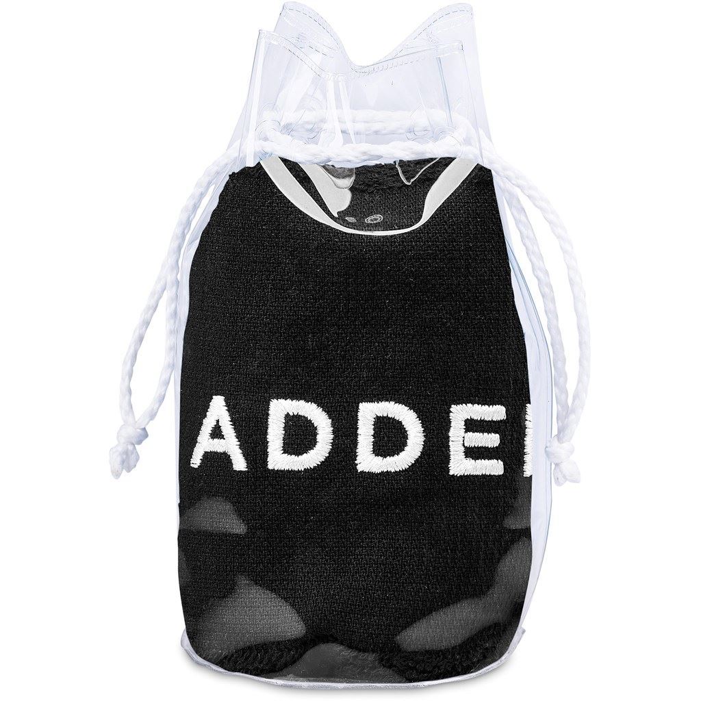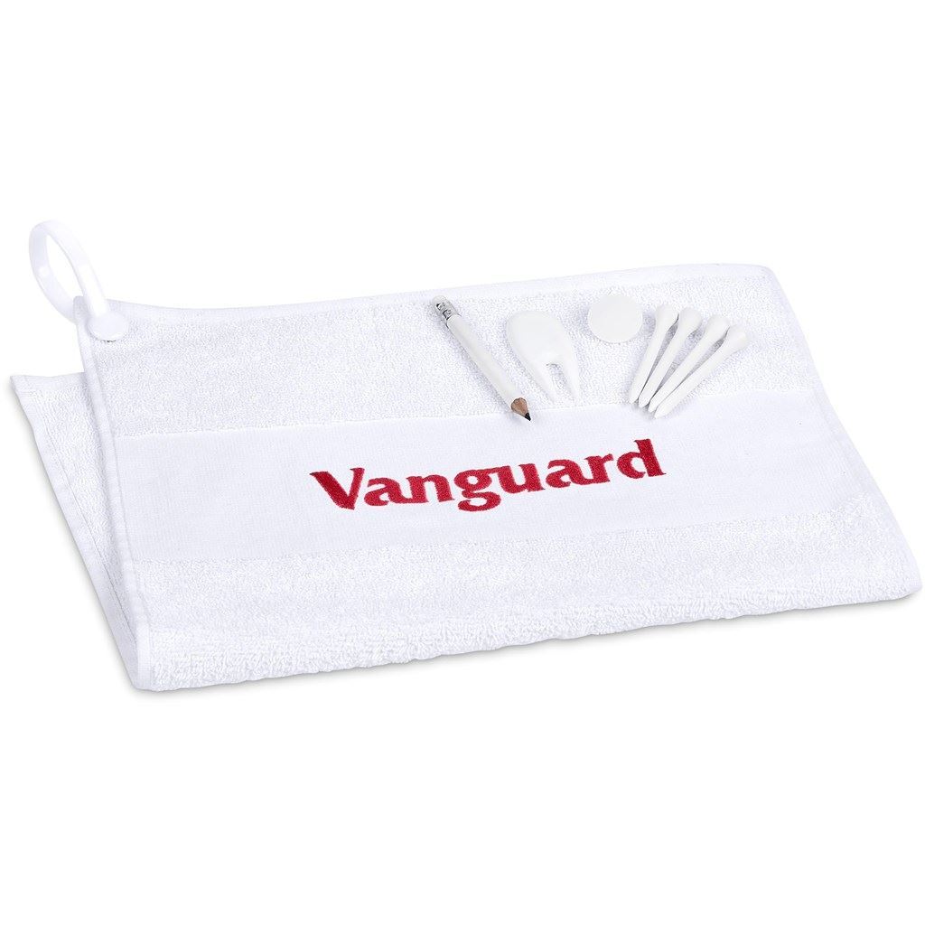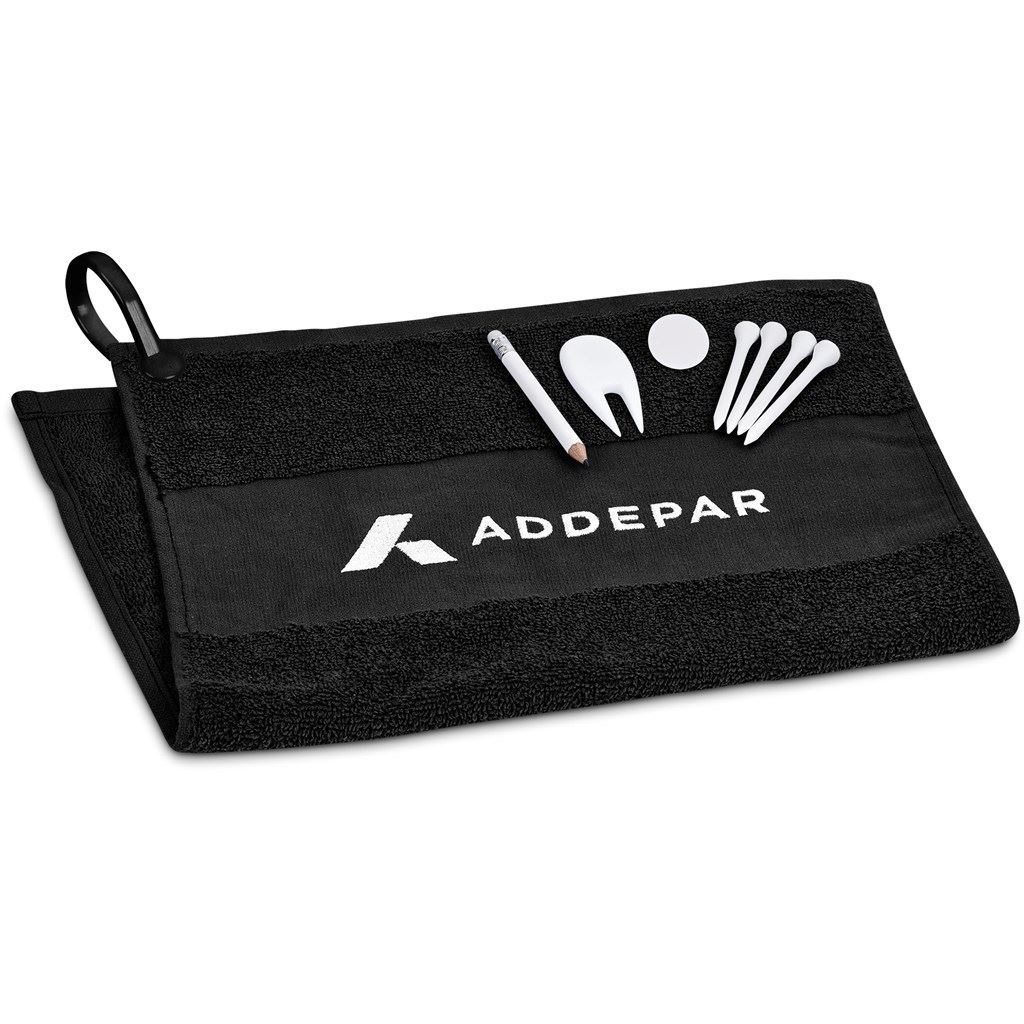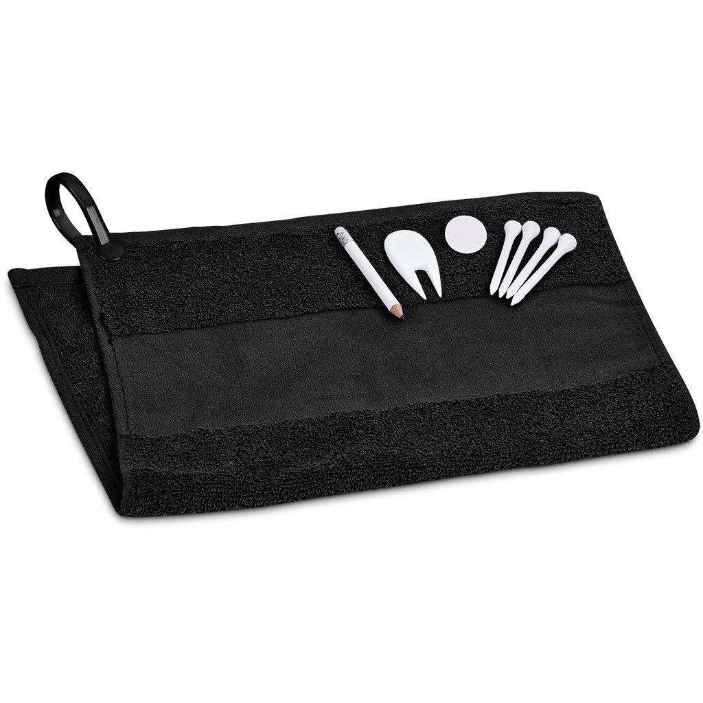 Altitude Monte Rei Golf Set This neatly packaged golf set is a great gift for golf days. It includes a 400g/m2 cotton golf towel, mini pencil with eraser, divot tool, ball marker and four golf tees. PVC pouch: 16 ( h ) x 8.5 ( d ) cm golf towel: 50 ( l ) x 35 ( w ) cm 400g/m2, 100% cotton plastic carabiner on towel to clip on golf bag flat strip woven into the towel for branding mini pencil with eraser divot tool ball marker four golf tees packaged together in a clear PVC drawstring pouch