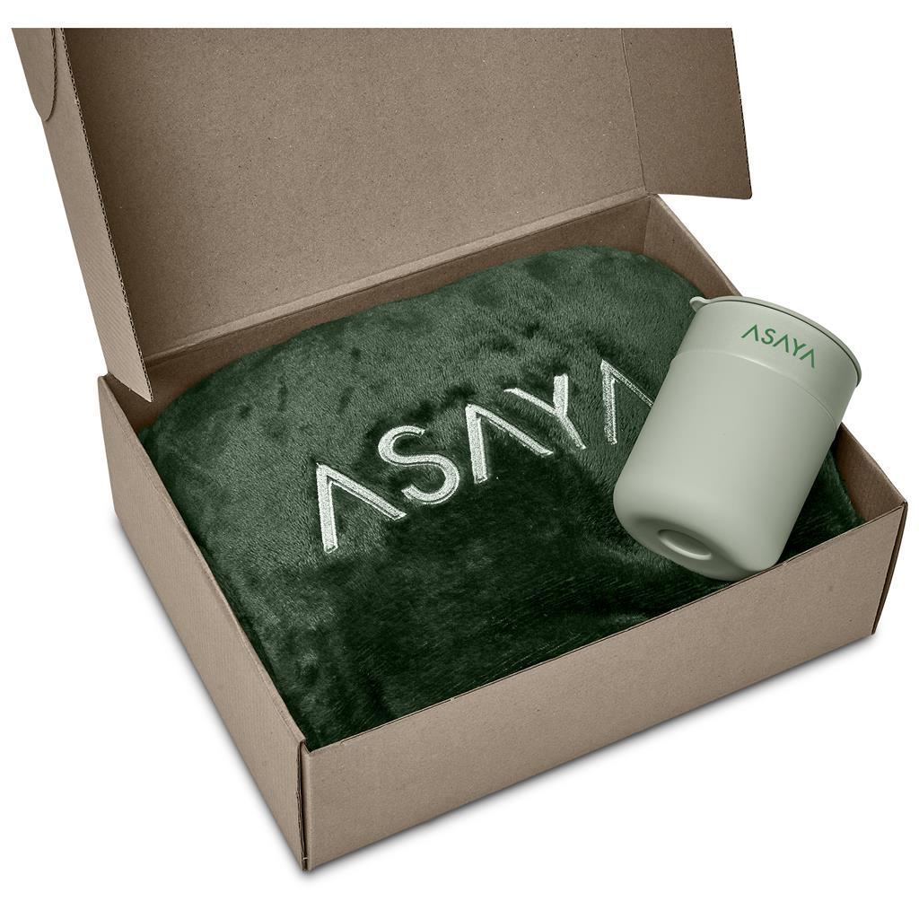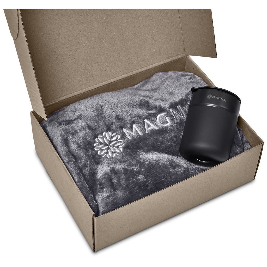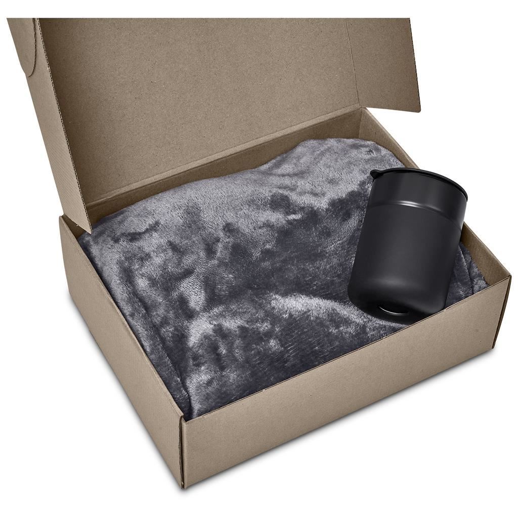 Altitude Snowdrift Gift Set This cosy and practical gift set is presented in a natural kraft box. The set features a warm fleece blanket, perfect for relaxing at home or keeping snug on cold days, paired with a ceramic coffee tumbler fitted with a silicone sleeve for comfortable handling and added protection from hot drinks. This gift set includes: Serendipio Huron Fleece Blanket 153 ( l ) x 127 ( w ) cm 220gsm fleece single-layer lustre sheen finish soft plush feel Serendipio Pimlico Ceramic Coffee Tumbler 10.5 ( h ) cm ceramic, PP & silicone 300ml insulating and protective silicone sleeve Altitude Bosley Gift Box A 30 ( l ) x 23 ( w ) x 10 ( h ) cm 1.2mm E flute corrugated board natural colour inside and out foldable cardboard gift box