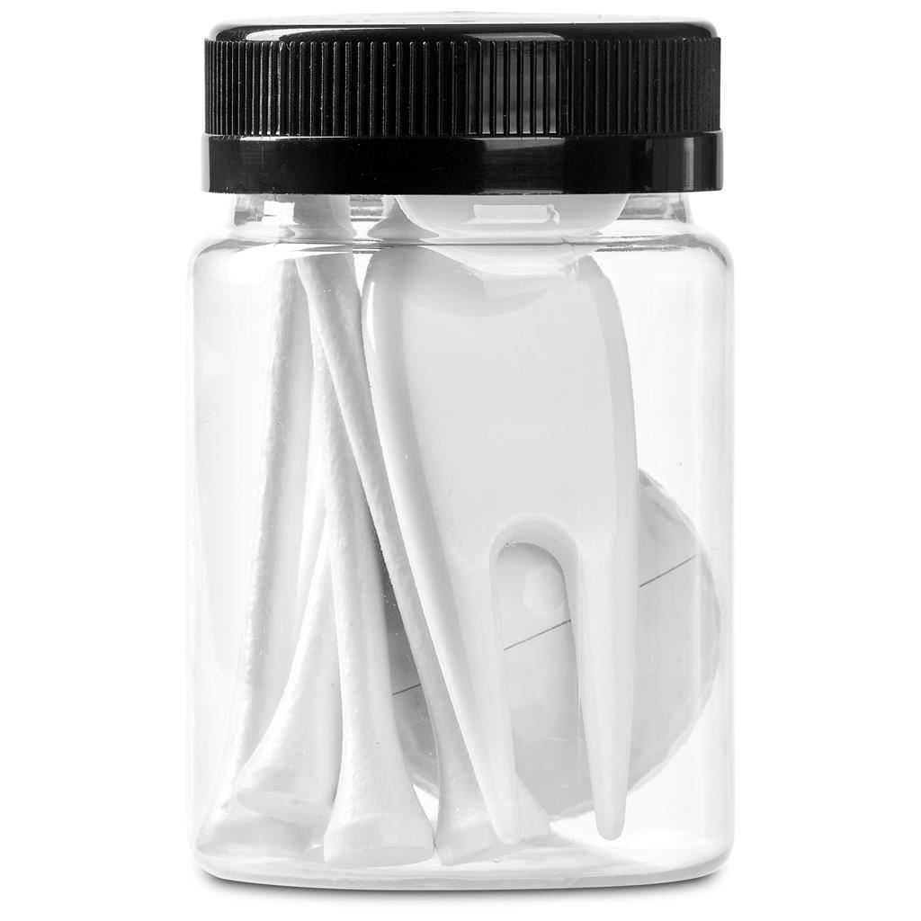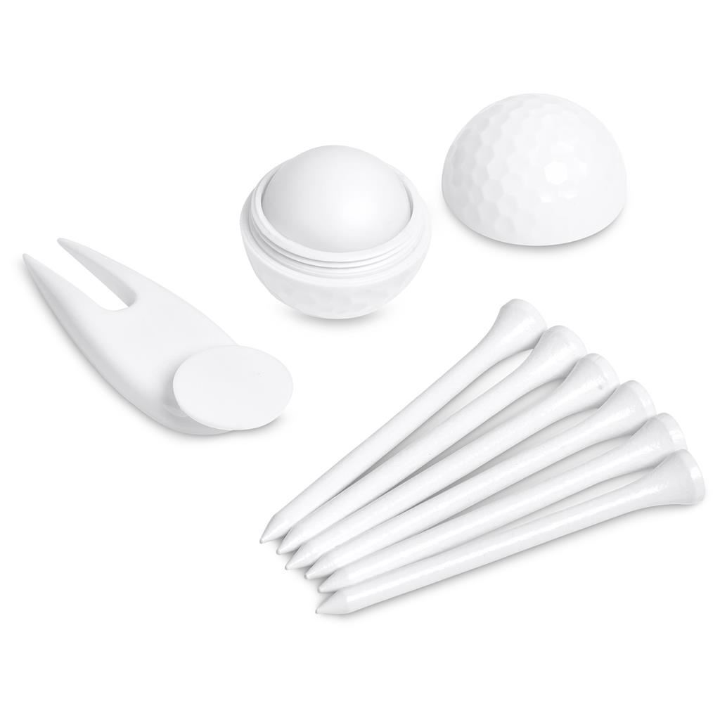 This handy golf gift set includes 6 white golf tees, a divot tool, a ball marker, and golf ball-shaped lip balm with SPF 30. An ideal giveaway for golf days and events.