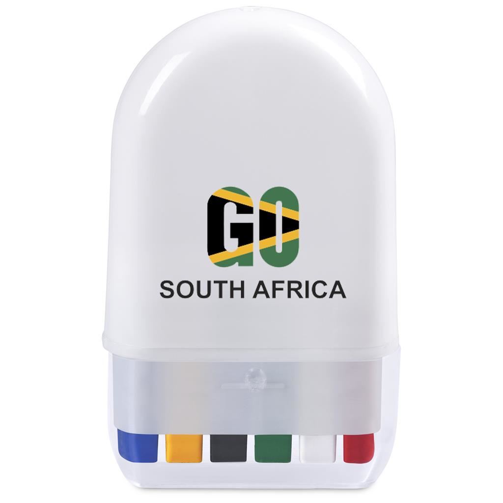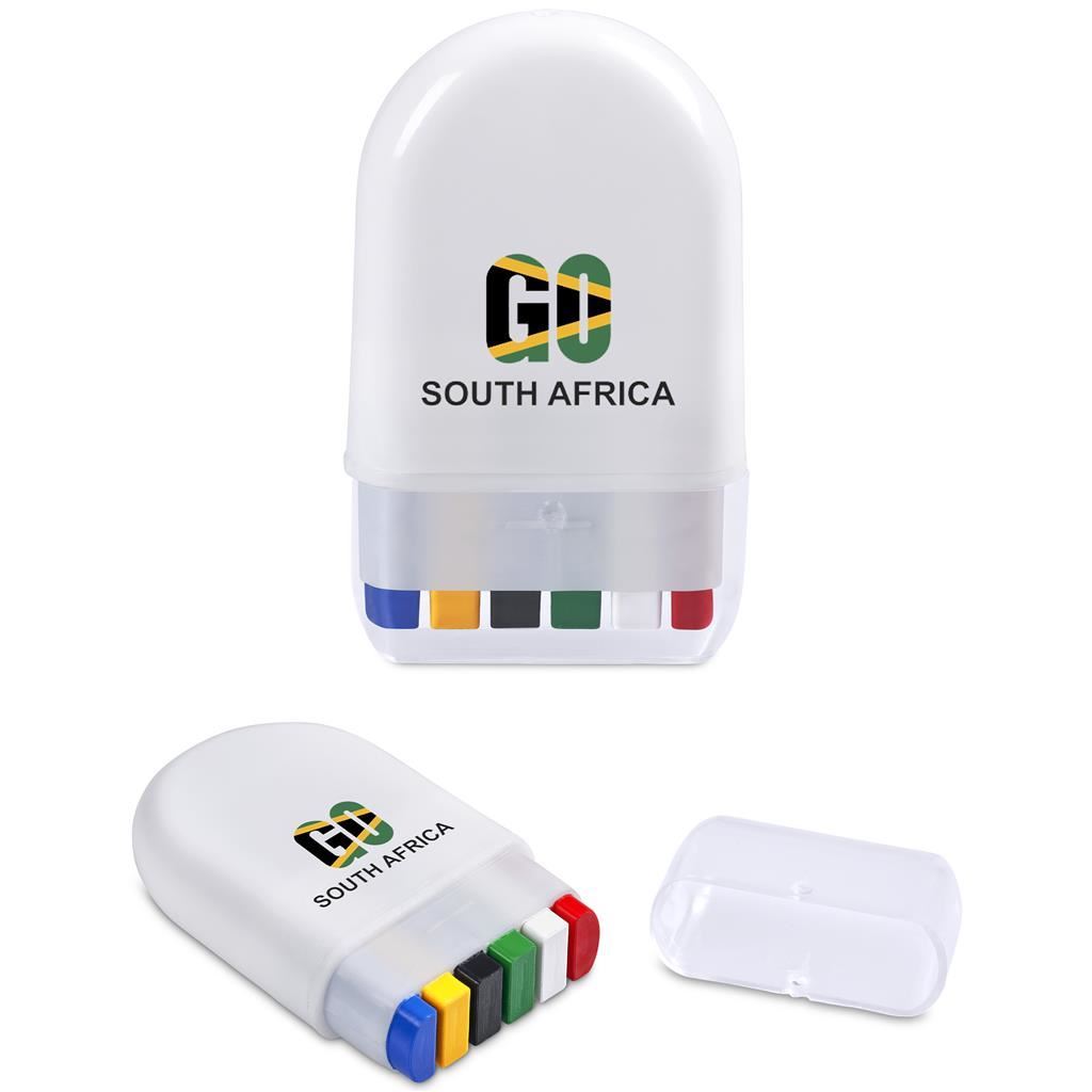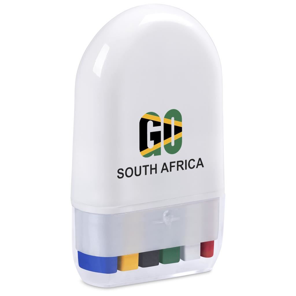 Altitude United Face Paint Turn any occasion into a celebration with this compact 6-in-1 face paint. Featuring the six colours of the South African flag, it’s an ideal product for sports events, festivals, school spirit days, and more. The water-washable formula applies smoothly and cleans off easily, giving you the fun without the fuss. 6 ( l ) x 3.5 ( w ) cm plastic & skin-friendly face paint 6 bold colours: black, white, green, yellow, red and blue (SA flag colours combination) water-washable formula - removes easily with soap and water. skin-friendly - gentle formulation suitable for most skins compact design - suitable for easy storage and transport bulk packed