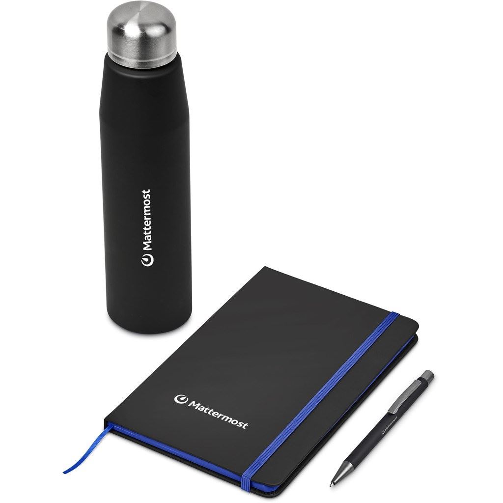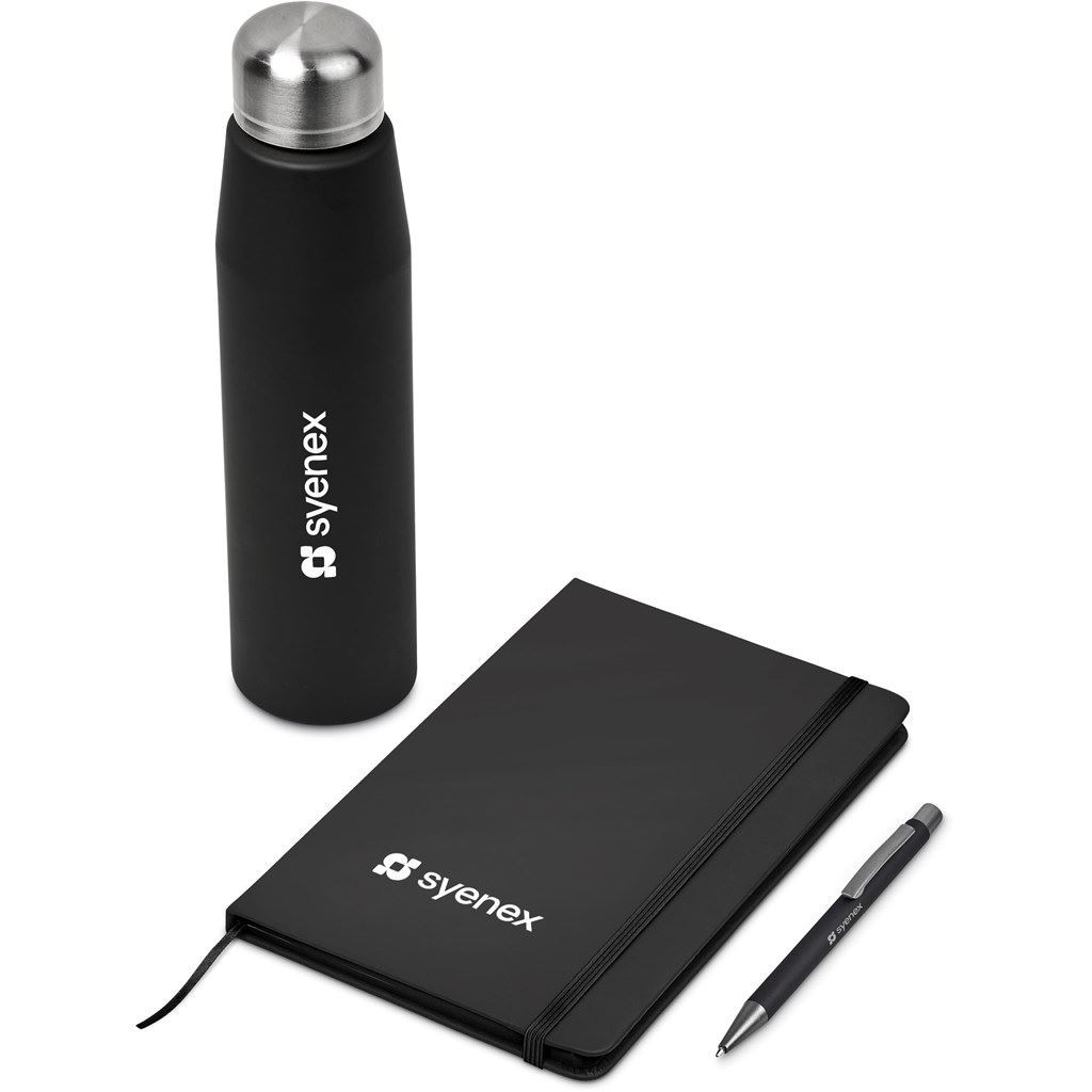 An aluminium bottle with a matte painted finish, an A5 notebook with a strap closure and a metal ball pen are neatly presented together in a gift box. The pen has a soft, matte finish and reveals a matte, light grey finish when lasered. This set is suitable as a client gift, or for staff and onboarding of new members to the team. A pre-packaged gift set not only looks impressive, but can also be a convenient and practical option when it comes to transport and delivery.