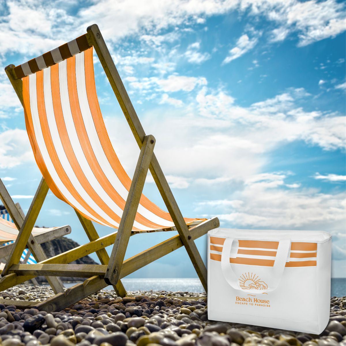 Beach Tote Bag The Beach Bag is manufactured using 600 Denier Polyester material. The bag is white in colour with beautiful coloured stripes at the top, to give you that summer look and feel. The bag has a front pocket to allow for additional storage as well as a zippered main compartment. 2 long denier webbed handles, complete this beautiful beach bag. Product Material: 600 Denier Polyester, Lining and Handles: 210 Denier Product Size cm:43 (L) x 33 (H) x 15 (W)