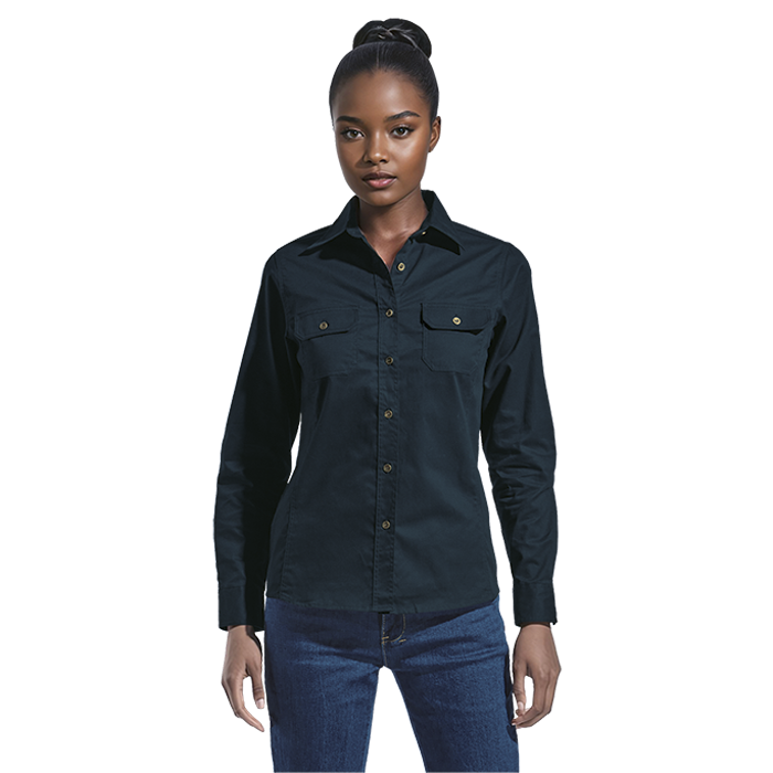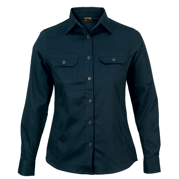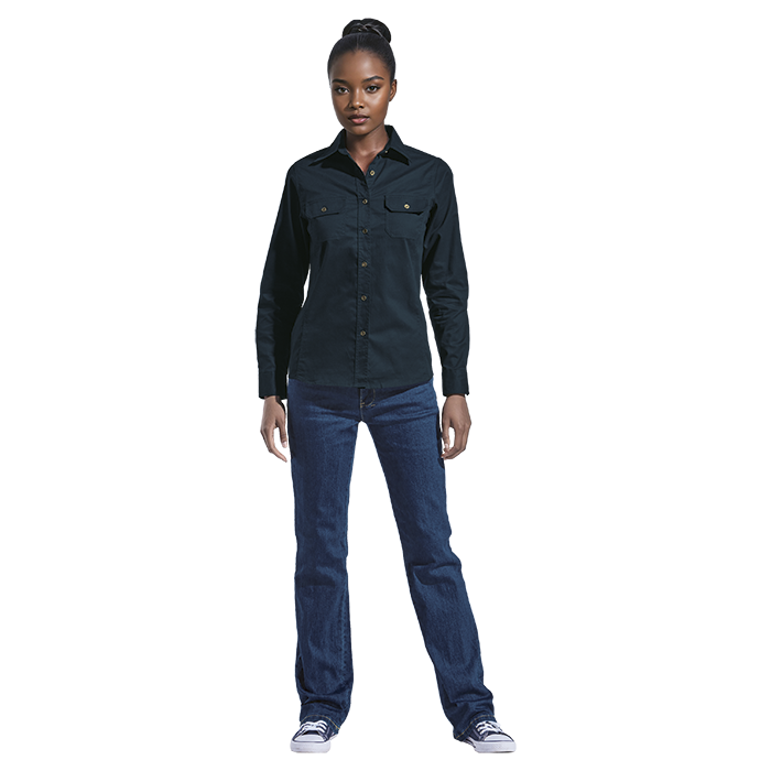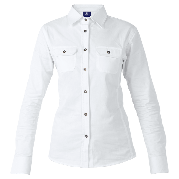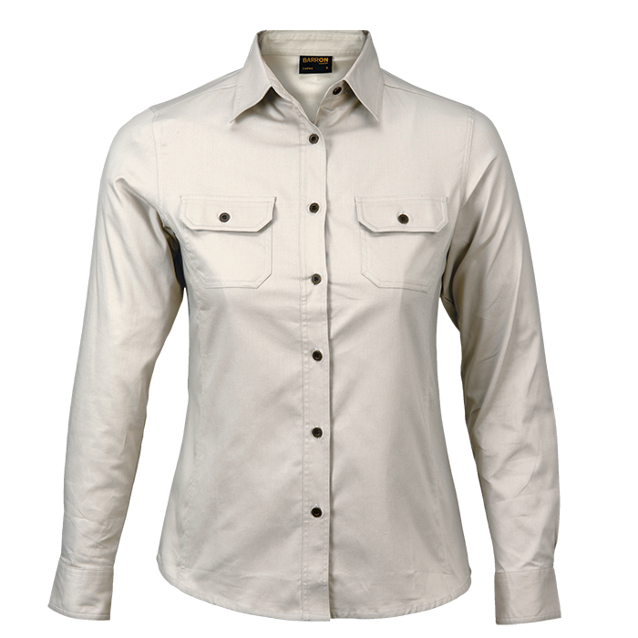 Bush Shirt Long Sleeve Ladies Meet the Barron Bush Shirt—your new outdoor BFF! Crafted from 100% breathable cotton twill, it boasts a feminine fit with shaped panels, adjustable cuffs, and durable double-needle finishing. Stylish metal buttons and handy chest pockets make adventure-ready chic effortless! • Long sleeves with adjustable cuffs • Shaped panels for a feminine fit • Two small chest pockets • Ladies’ blouse with tapered side seams • Curved hem • Double-needle finishing for strength and durability • 100% Cotton twill fabric • Metal buttons