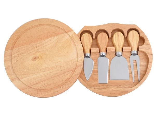 Chateau Cheese Board & Knife Set Colour(s):Brown Material Wood and Stainless Steel Size: 20 (l) x 20 (w) x 3.5 (d) Swivel lid to open the set and use the lid as a serving board. Includes 3 x Knives and 1 x Fork Packaging: Gift Box