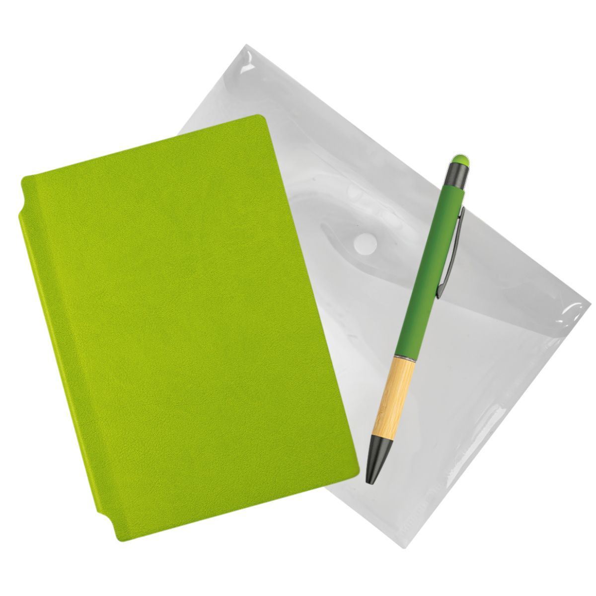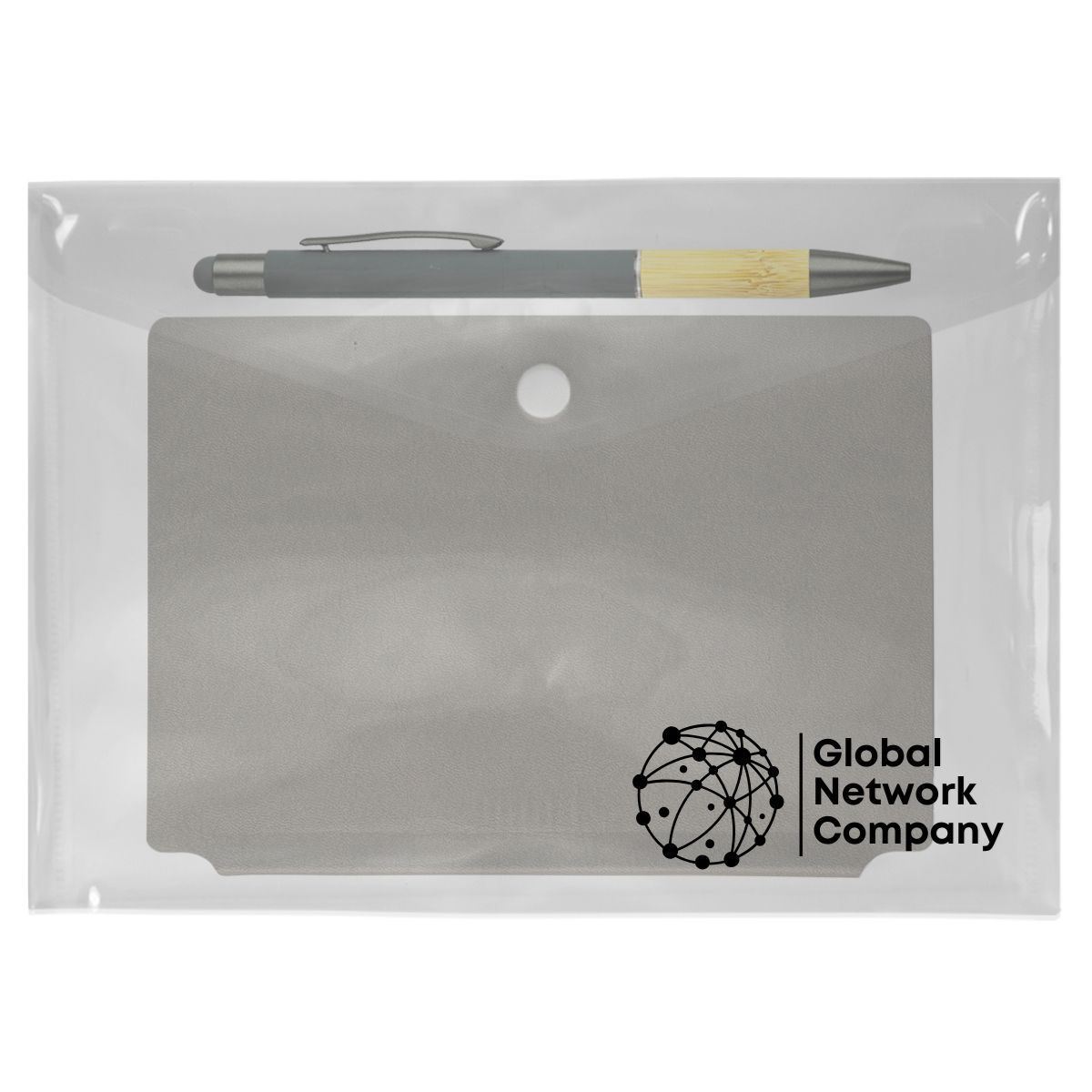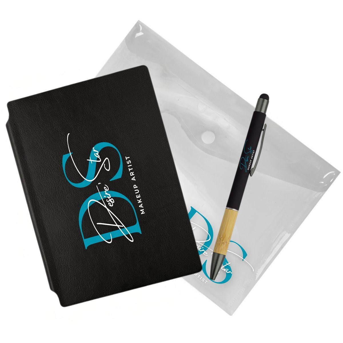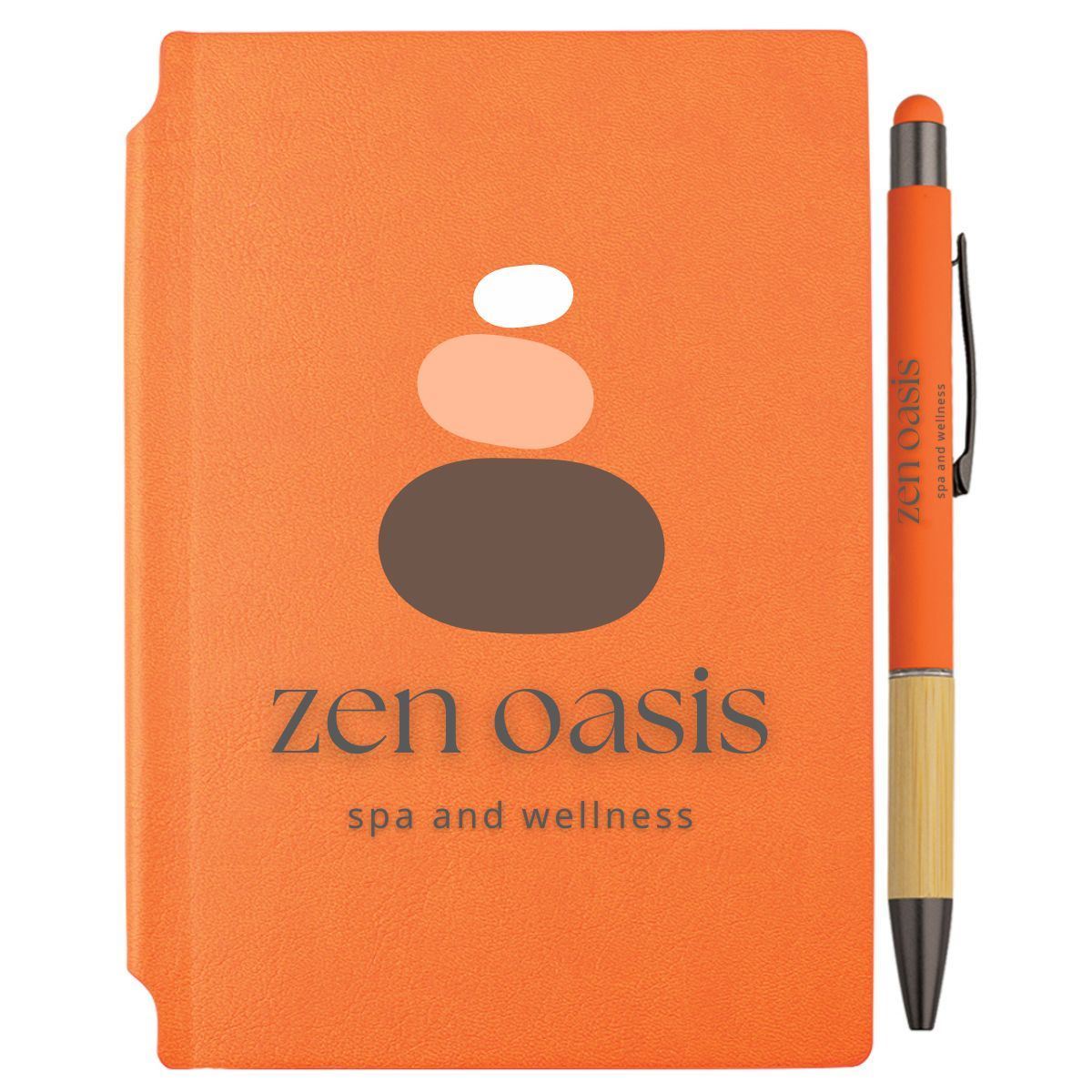 Conscious Companion Notebook & Pen Set The Conscious Companion Notebook & Pen Set combines two everyday essentials in one elegant and eco-conscious package: The Soft-Touch Notebook comes in a vibrant range of colours and features 80 lined pages. Each notebook includes a matching bookmark string and a built-in pen holder on the side. It writes effortlessly with smooth black ink. The Hana Bamboo Ballpoint Pen is crafted from a combination of premium aluminium and sustainable bamboo. It features a plastic clicker with a built-in stylus tip, a plastic clip, an aluminium and bamboo barrel, and a plastic tip. This sleek pen writes smoothly with black ink. Product Material: PU (Polyurethane Leather), 70GSM, Paper, 80 Lined Pages, Bamboo, Aluminium