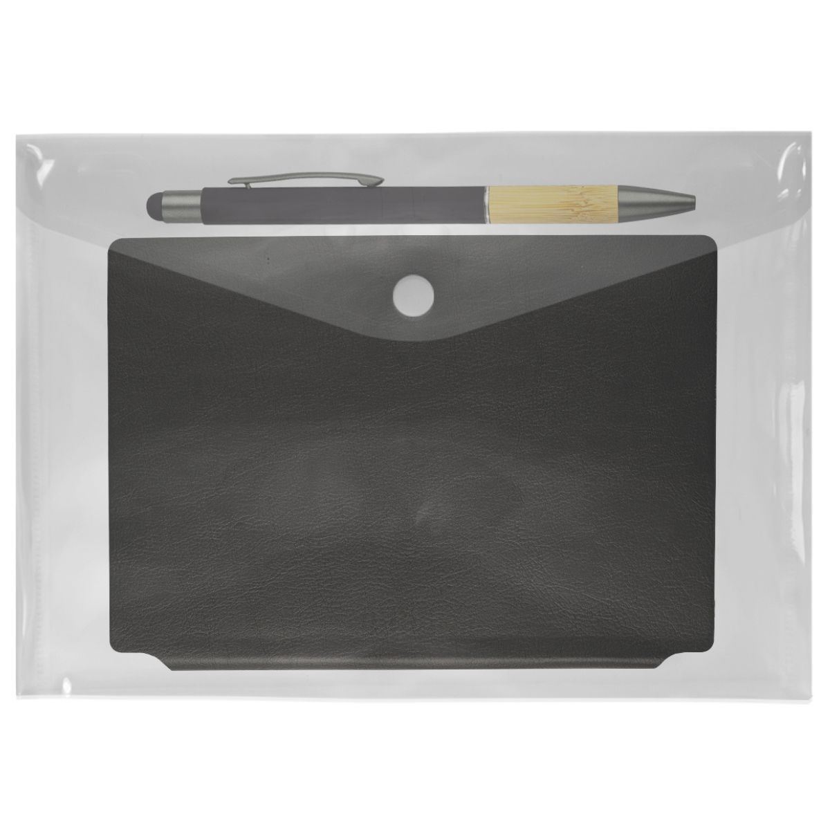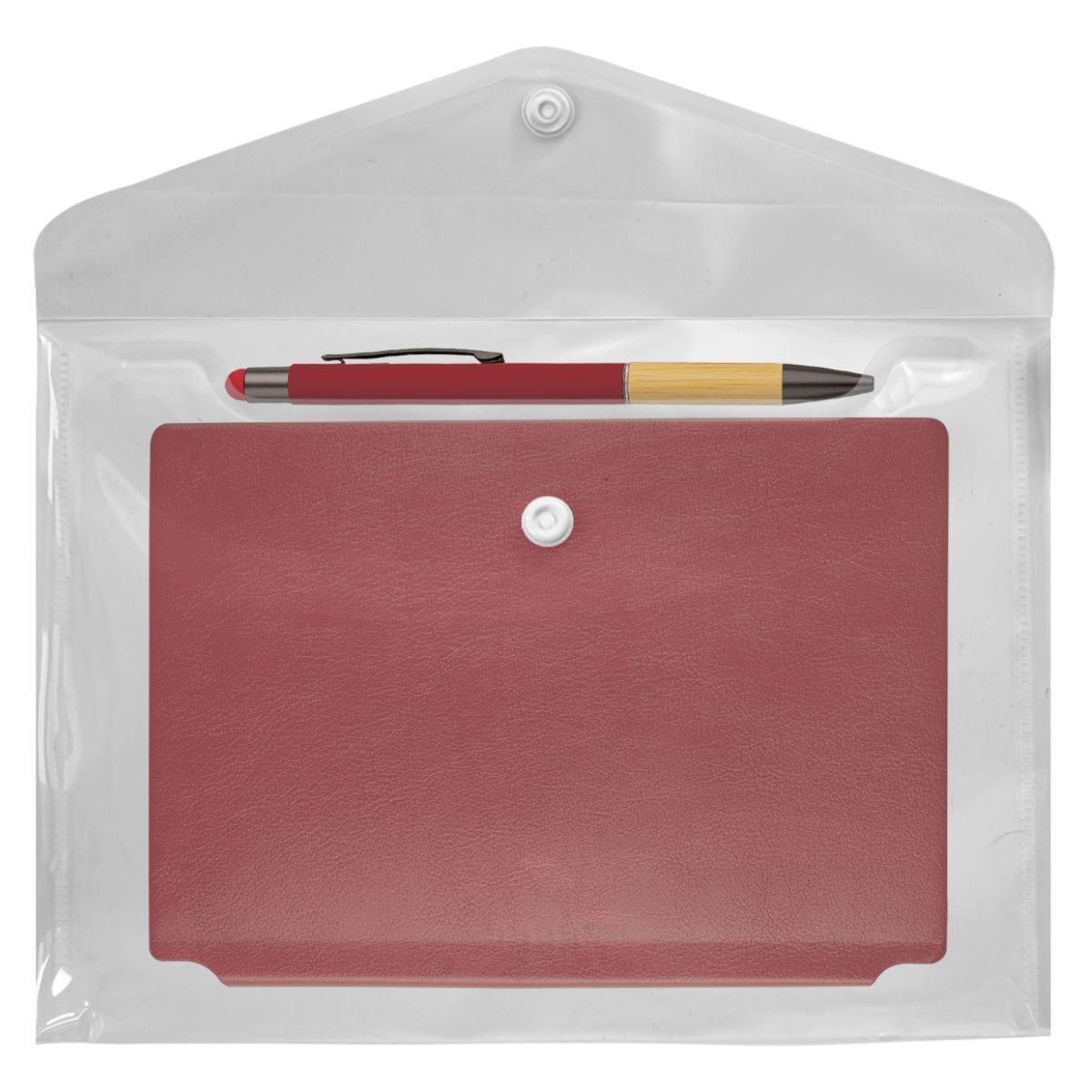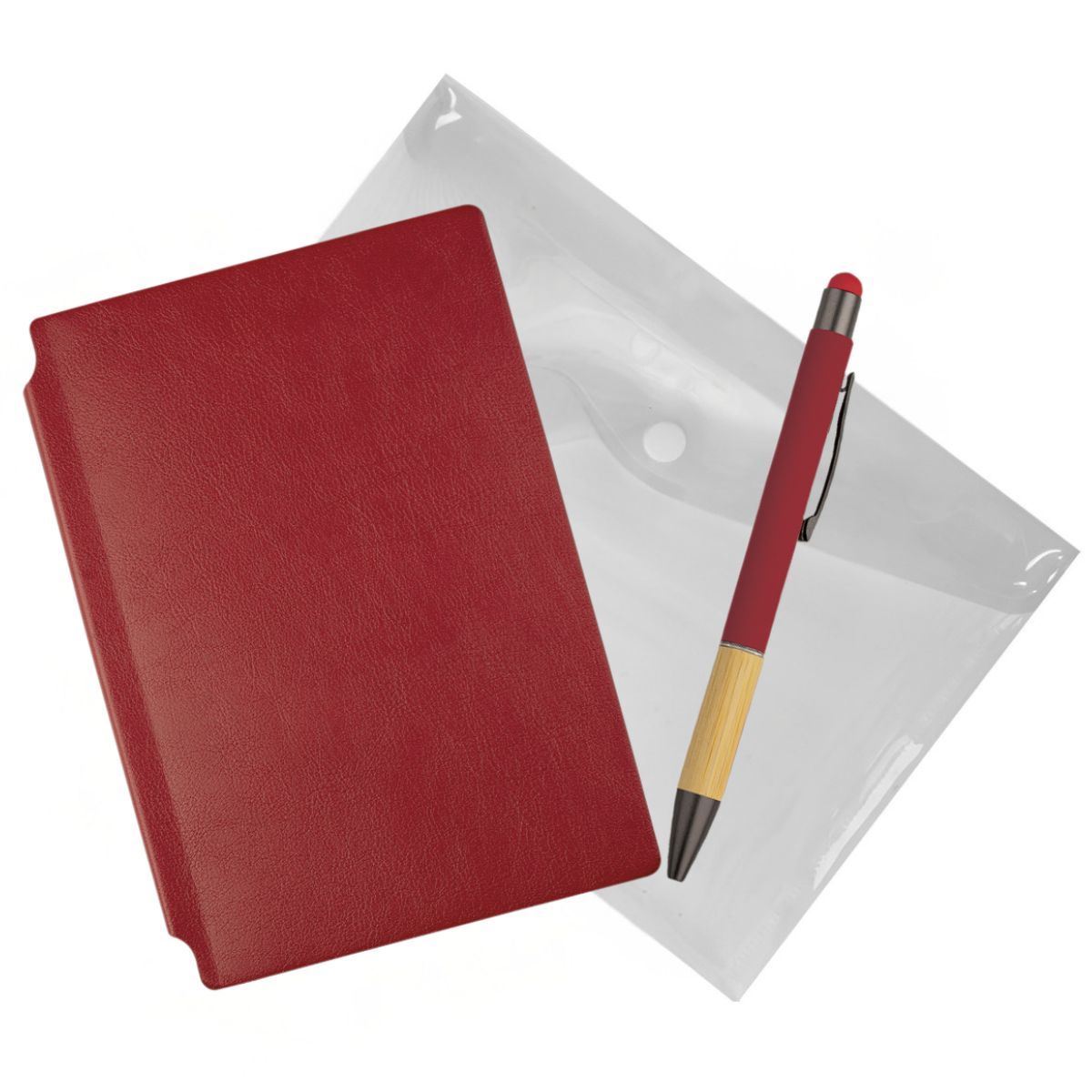 Conscious Companion Notebook & Pen Set The Conscious Companion Notebook & Pen Set combines two everyday essentials in one elegant and eco-conscious package: The Soft-Touch Notebook comes in a vibrant range of colours and features 80 lined pages. Each notebook includes a matching bookmark string and a built-in pen holder on the side. It writes effortlessly with smooth black ink. The Hana Bamboo Ballpoint Pen is crafted from a combination of premium aluminium and sustainable bamboo. It features a plastic clicker with a built-in stylus tip, a plastic clip, an aluminium and bamboo barrel, and a plastic tip. This sleek pen writes smoothly with black ink. Product Material: PU (Polyurethane Leather), 70GSM, Paper, 80 Lined Pages, Bamboo, Aluminium