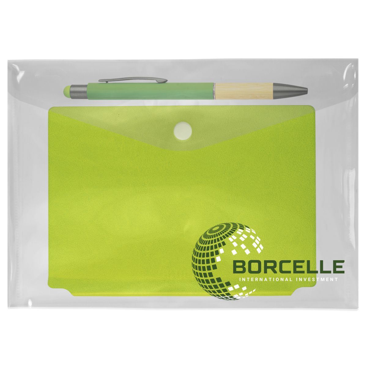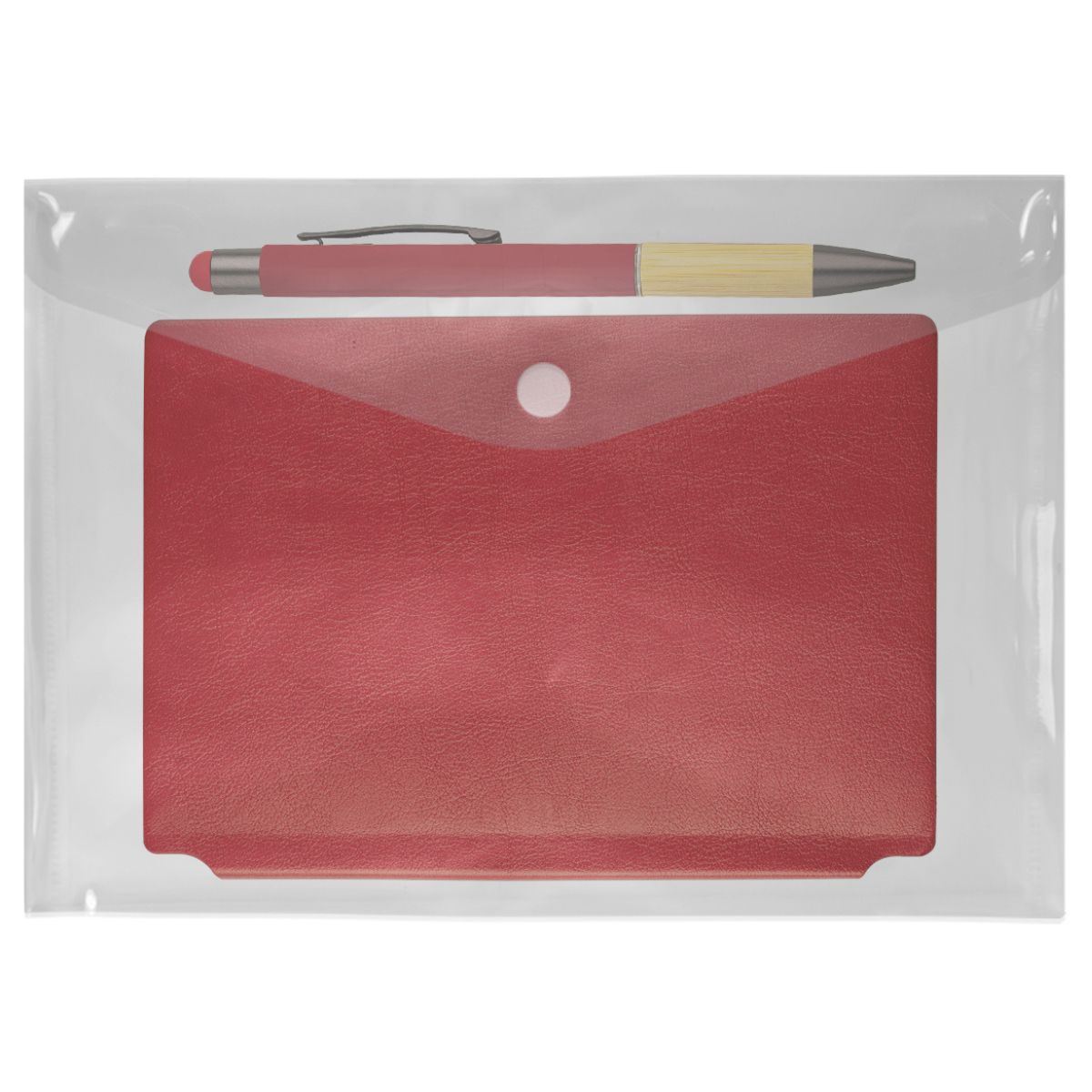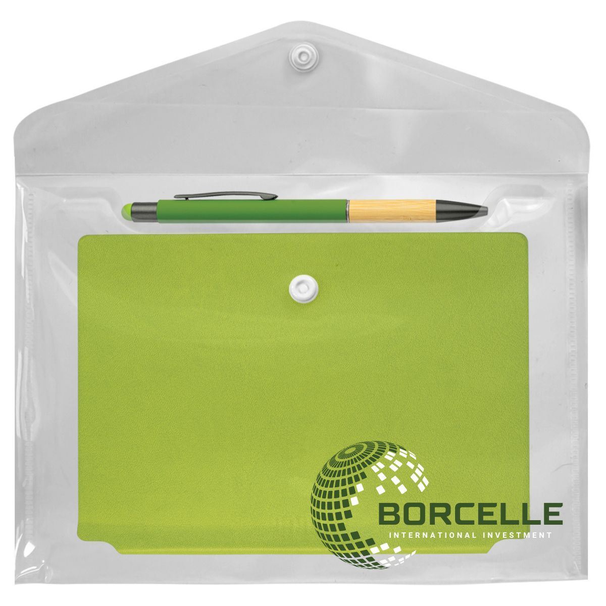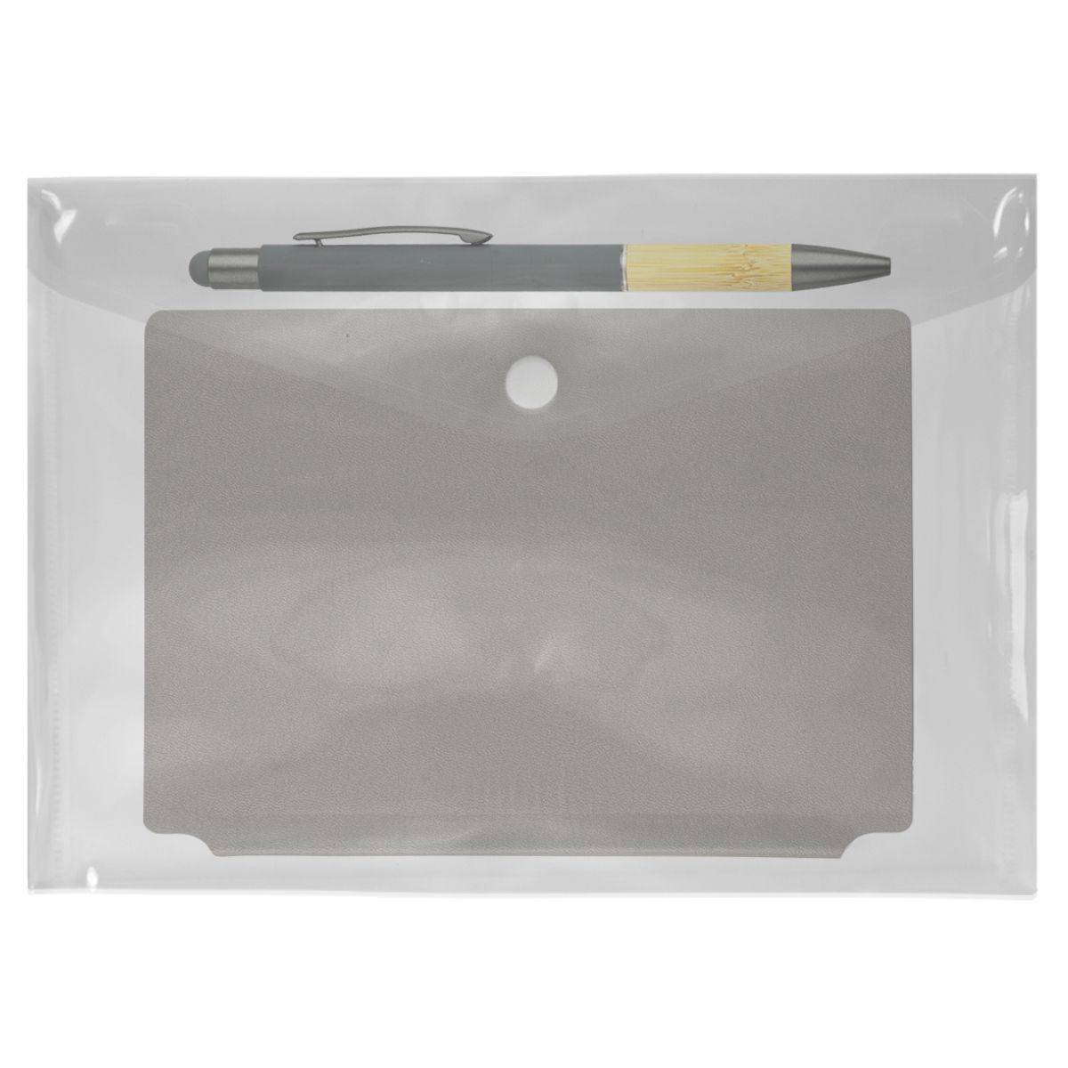 Conscious Companion Notebook & Pen Set The Conscious Companion Notebook & Pen Set combines two everyday essentials in one elegant and eco-conscious package: The Soft-Touch Notebook comes in a vibrant range of colours and features 80 lined pages. Each notebook includes a matching bookmark string and a built-in pen holder on the side. It writes effortlessly with smooth black ink. The Hana Bamboo Ballpoint Pen is crafted from a combination of premium aluminium and sustainable bamboo. It features a plastic clicker with a built-in stylus tip, a plastic clip, an aluminium and bamboo barrel, and a plastic tip. This sleek pen writes smoothly with black ink. Product Material: PU (Polyurethane Leather), 70GSM, Paper, 80 Lined Pages, Bamboo, Aluminium