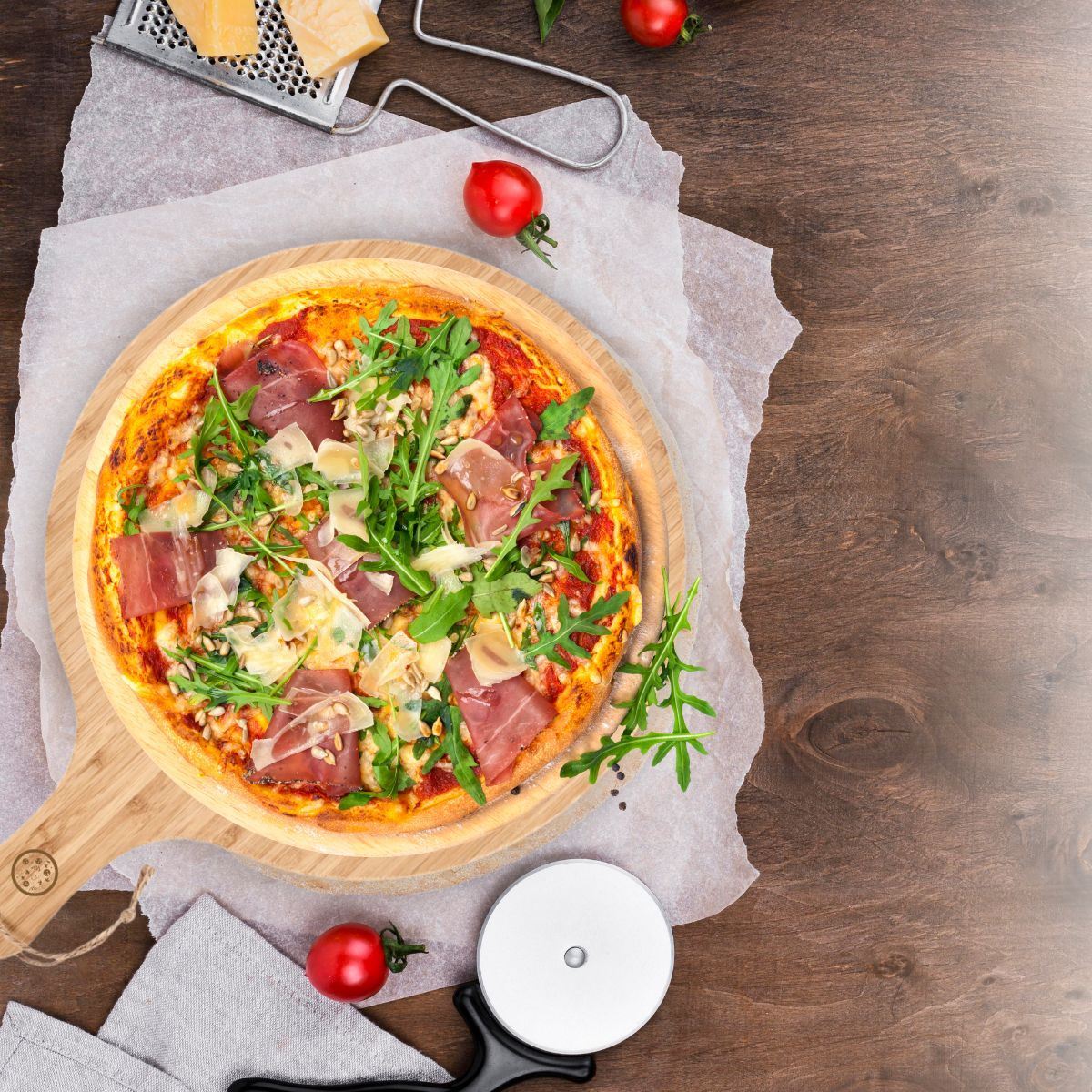Cutting board made from Bamboo wood with a convenient serving handle ● Ideal for serving food and snacks during parties ● Cut vegetables on it or present it as a large cheese board ● With a diameter of 31.5cm it is large enough to also serve pizza on ● When you are not using the cutting board, you can hang it up by its Jute hanging cord