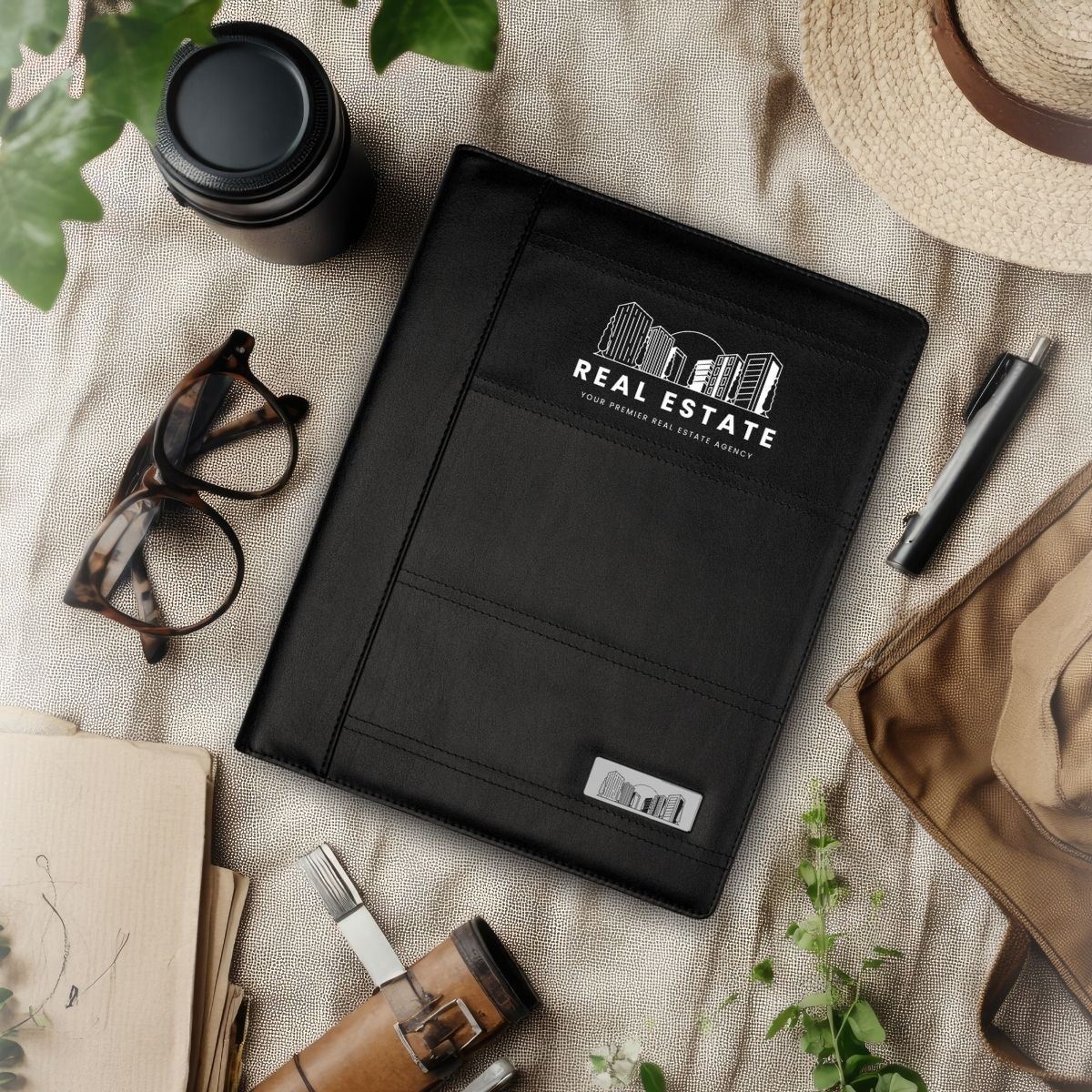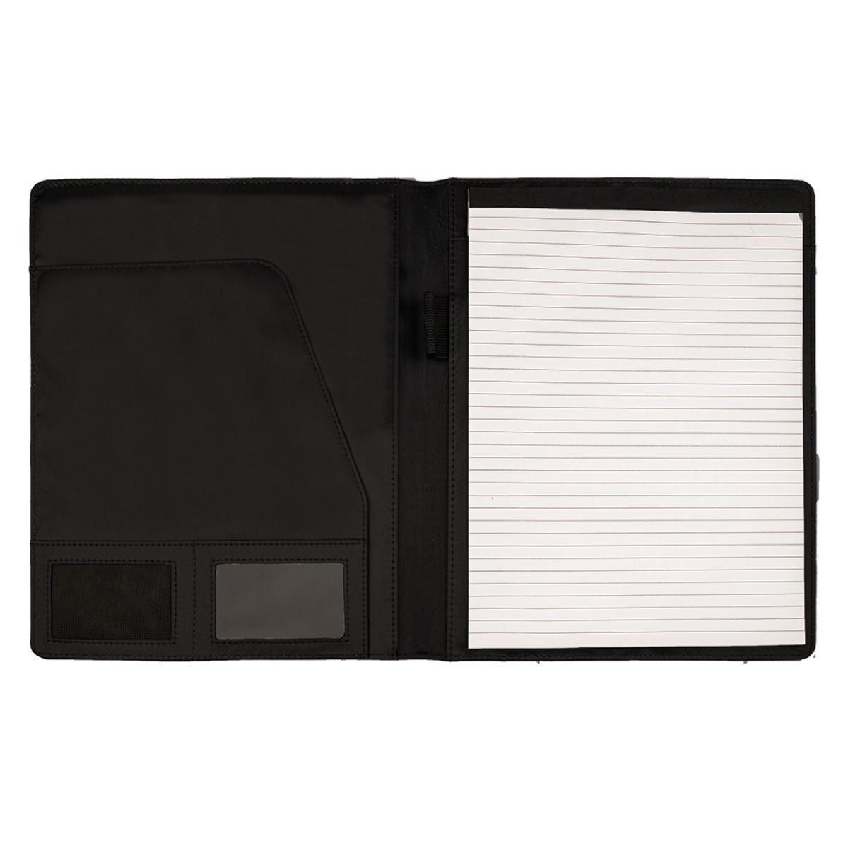 Lepidus A4 Folder Code: FOLD23990 The Lepidus A4 Folder, a stylish essential manufactured from premium PU materials in classic black, it exudes sophistication. Flip it open to unveil a thoughtful design, one side features storage compartments and a convenient pen loop for seamless organization, while the other side boasts a spacious document compartment, ensuring you're always prepared for productivity. Specifications PU (Polyurethane Leather) , Paper, 20 Lined Pages Product Size: 26(L) x32(H) x2(W)