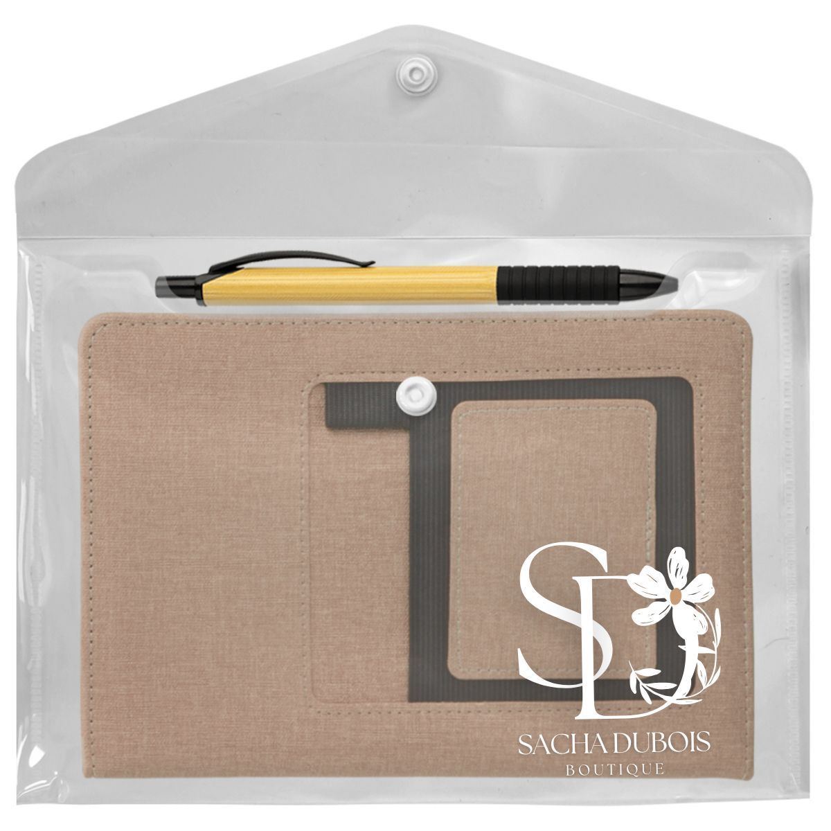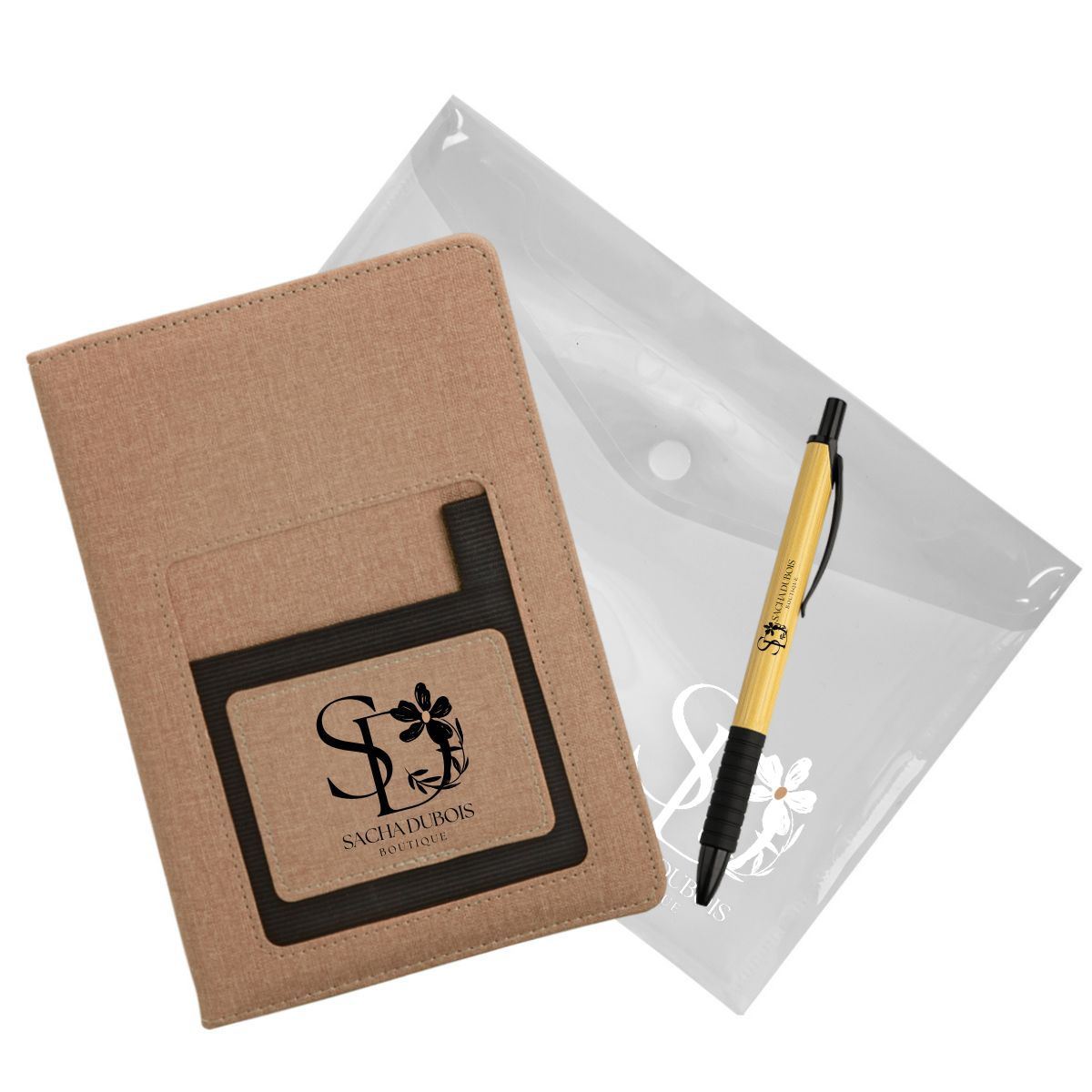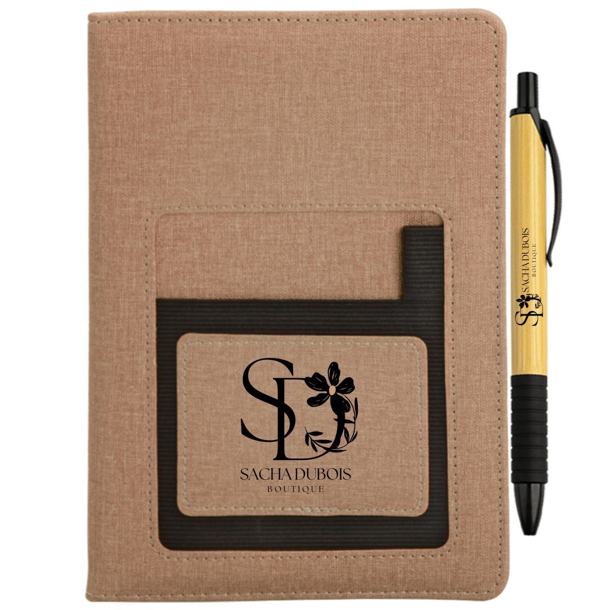 Pocket Notebook: Crafted from durable PU material, A5-sized, with approximately 90 lined pages, an elasticated pen loop, and a front pocket for added storage.