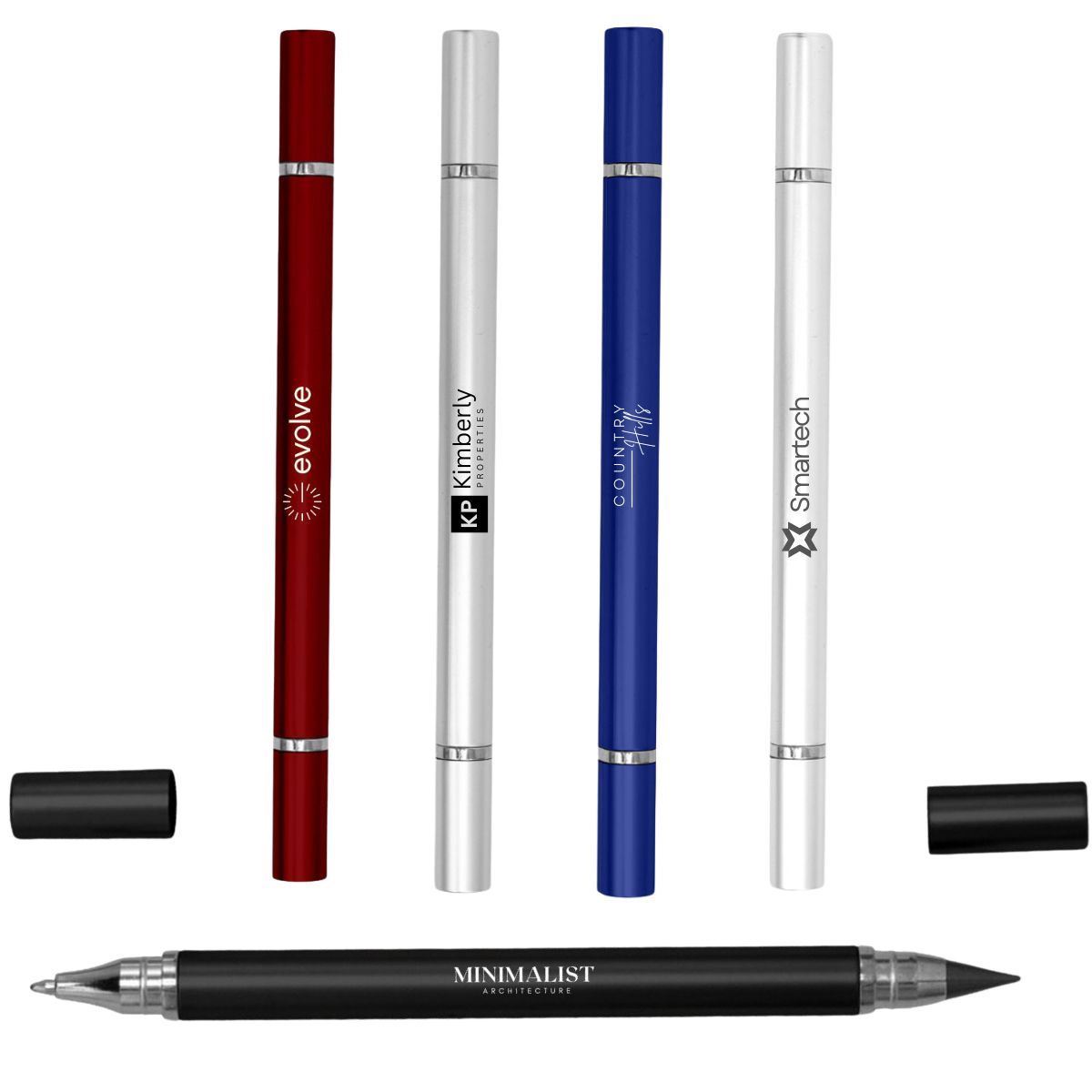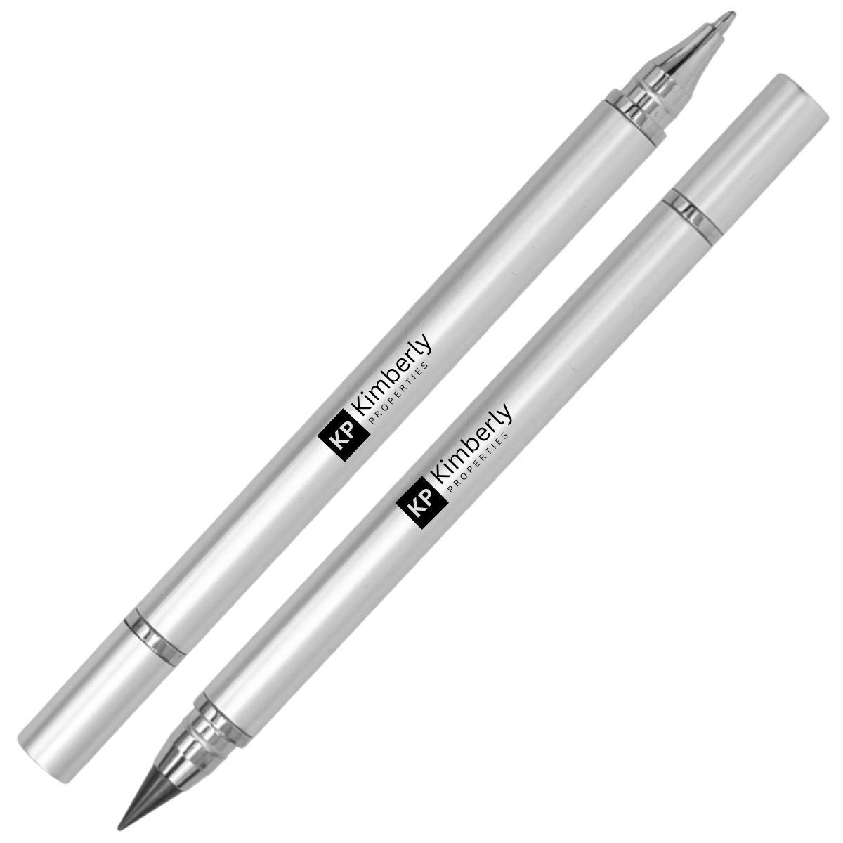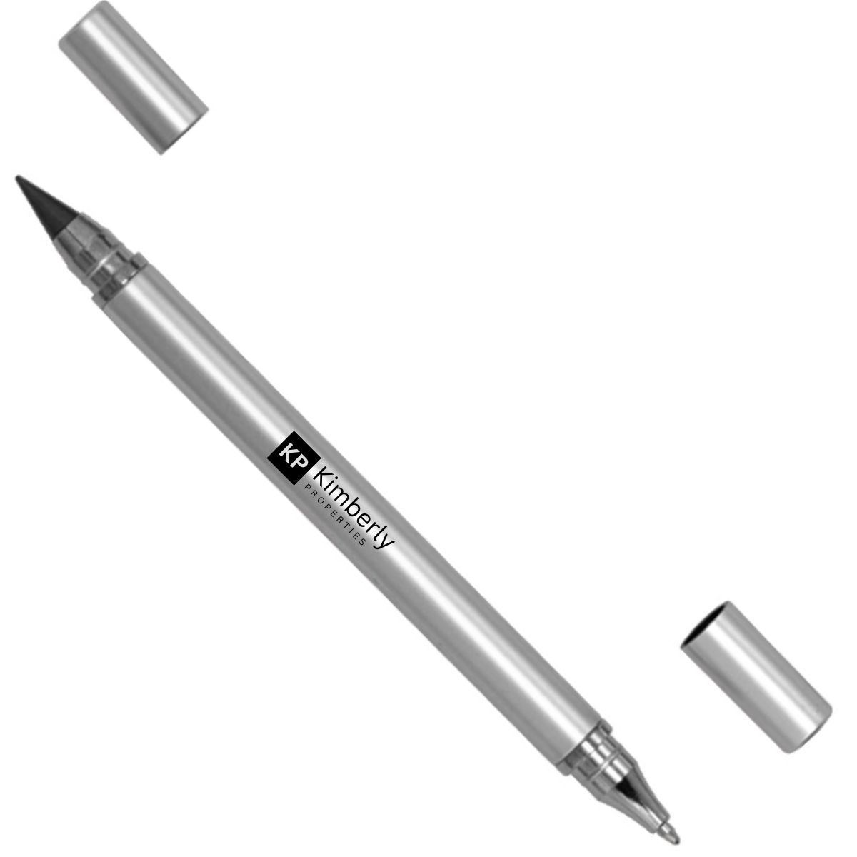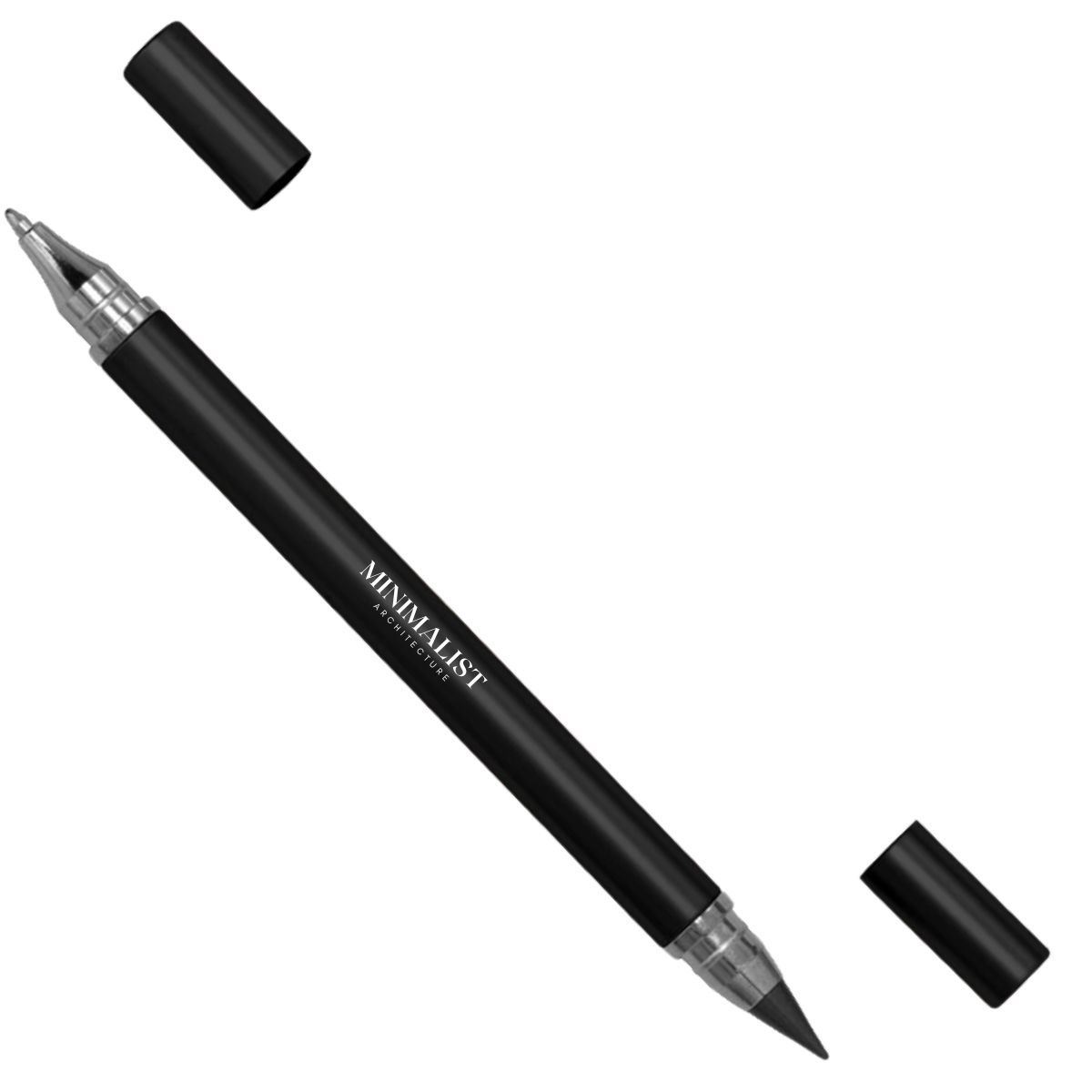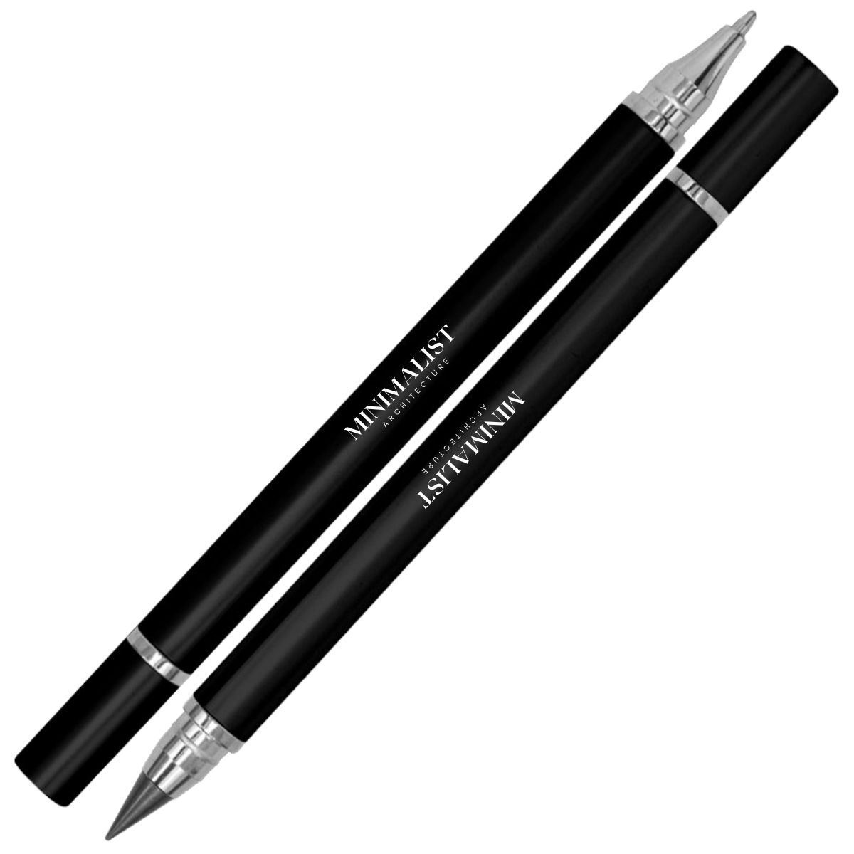 Metallic Pen & Eternal Pencil Code: PEN25205 The Metallic Pen & Eternal Pencil is a sleek, dual-purpose writing instrument designed for versatility and convenience. Crafted from durable ABS plastic, it features a smooth matte black finish with two silver tips—each protected by matching matte black caps for a cohesive, modern look. One end houses a traditional ballpoint pen, while the other features an eternal pencil with a durable ceramic tip that never needs sharpening. This stylish, space-saving tool is perfect for professionals, creatives, and anyone who values function with a minimalist edge. Specifications ABS Plastic Product Size: 13.8 (H) x 1 (W)