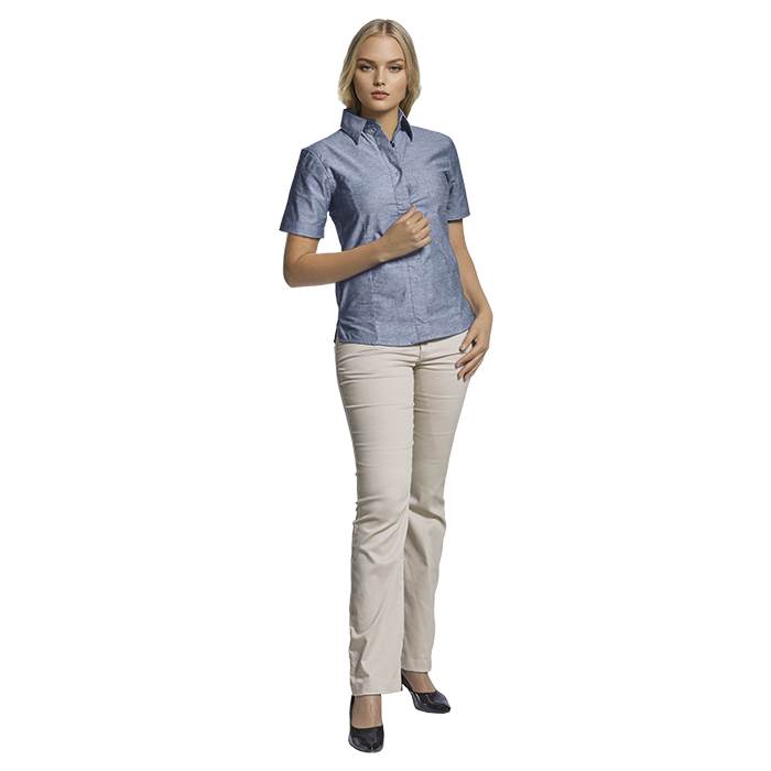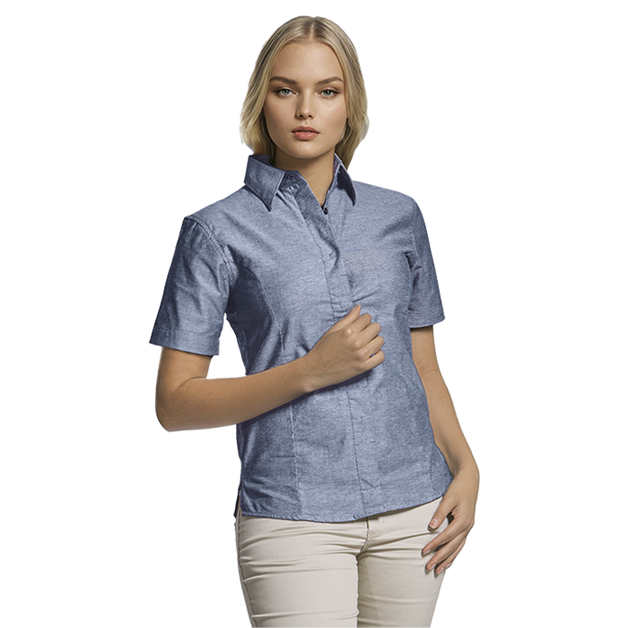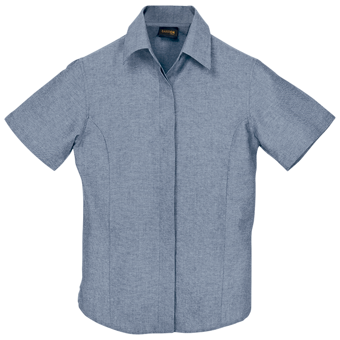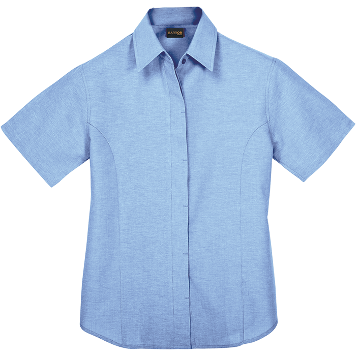 Oxford Blouse Short Sleeve Ladies Step into style and comfort with the Barron Oxford Blouse! This cotton-rich, melange masterpiece features a chic raised collar, curved hem, and concealed buttons—perfect for all-year office glam. Feminine, flawless, and proudly South African—your new go-to power blouse awaits! • Raised collar • Available in long and short sleeves • Shaped side panels with a curved hem • Corporate ladies’ blouse with feminine styling • Concealed button stand • 60/40 Cotton rich two-tone fabric • Proudly South African • SMETA • OEKO-TEX • Due to the nature of this melange fabric, we cannot guarantee consistency in colours