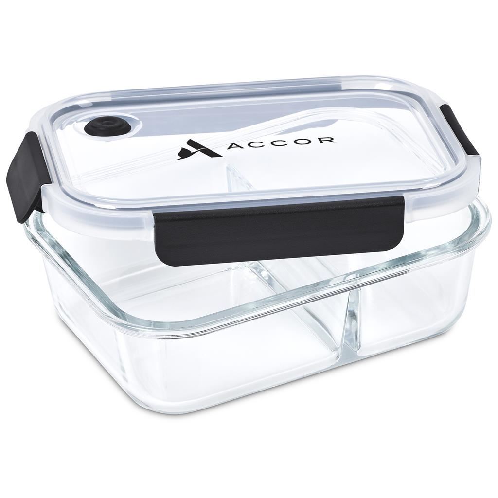 Featuring a glass base with a lockable plastic lid, this food container is ideal for food storage, meal preparation, freezing leftovers, and packing lunches in a safe and hygienic manner. It’s designed with two compartments to separate food. The container features a durable plastic lid with a silicone leak-proof seal and four secure clip-locks. The built-in silicone ventilation plug can be opened to prevent pressure build-up when heating contents in the microwave.