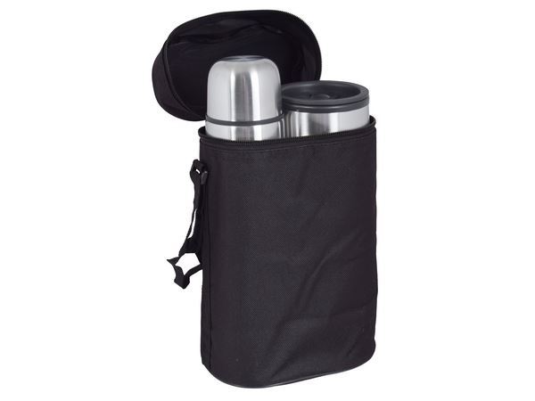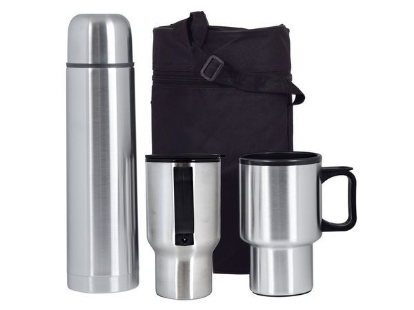 Thermal Flask and Mug Set Colour(s): Silver Material:Stainless Steel Size:28 (l) x 16 (w) x 10 (d) 750ml Stainless Steel Vacuum Flask, 2 x 400ml Stainless Steel Mugs Packaging: Black Nylon Zip Bag