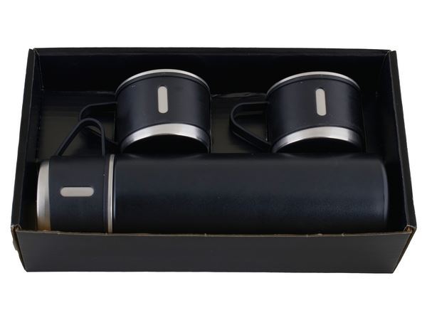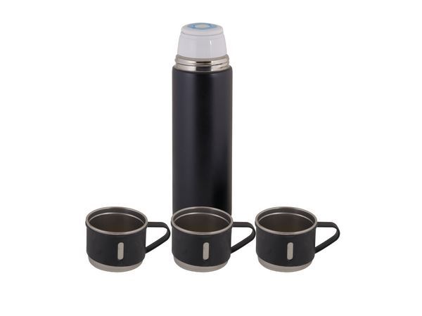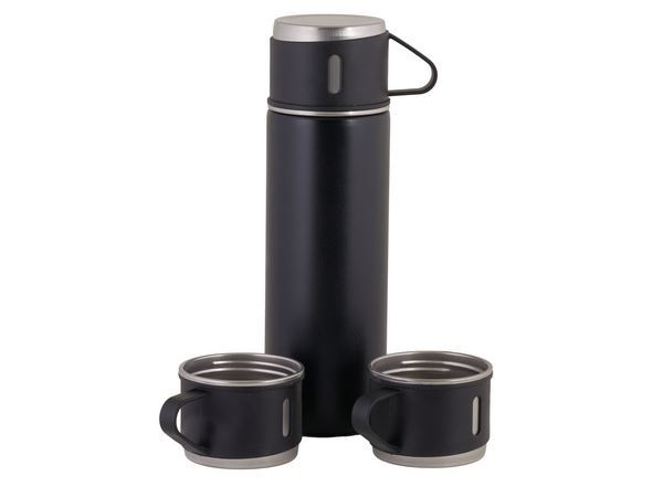 Vacuum Flask & Mini Mug Set 500ml Flask has double-wall stainless steel insulation, keeping beverages hot and cold. With a Hermetic vacuum seal, ensuring perfect waterproofing and an odourless inner lining. Includes 3 x 120ml matching mini mugs, perfect for sharing coffee, tea or a cold beverage, that also fit on the flask as a lid. Colour(s):Black Material:Stainless Steel 201SS outer & 304SS inner & Recycled Plastic Size:14 (w) x 25 (h) x 7 (d) Packaging:Box with gift bag