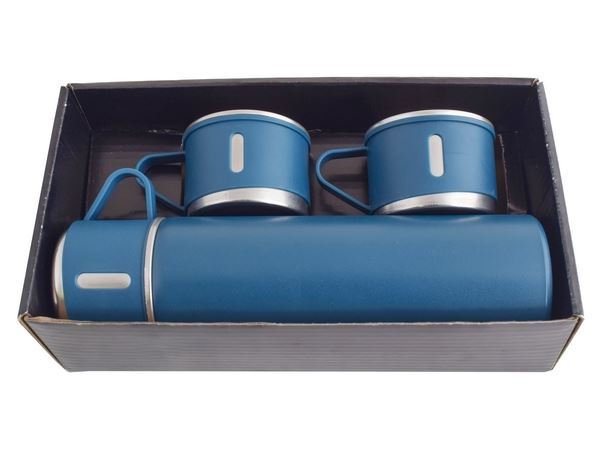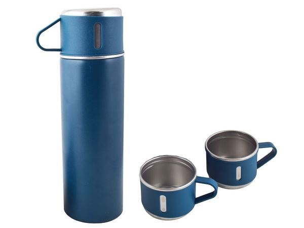 Vacuum Flask & Mini Mug Set 500ml Flask has double-wall stainless steel insulation, keeping beverages hot and cold. With a Hermetic vacuum seal, ensuring perfect waterproofing and an odourless inner lining. Includes 3 x 120ml matching mini mugs, perfect for sharing coffee, tea or a cold beverage, that also fit on the flask as a lid. Colour(s):Blue Material:Stainless Steel 201SS outer & 304SS inner & Recycled Plastic Size:14 (w) x 25 (h) x 7 (d) Packaging:Box with gift bag