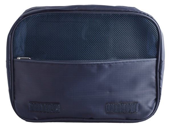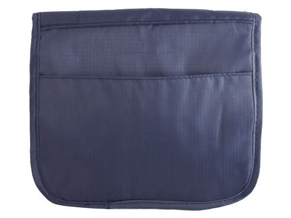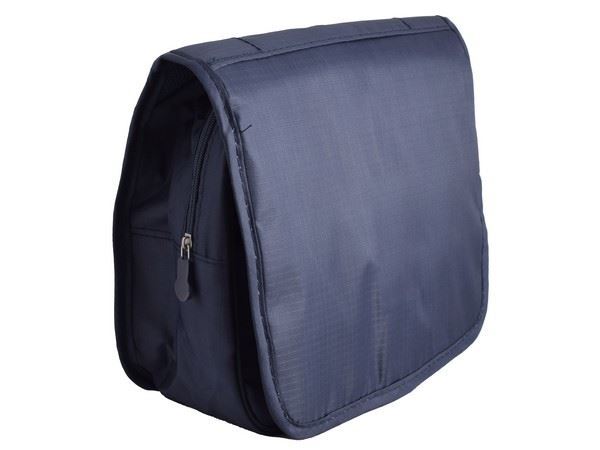 Includes Main Zip Compartment, Front Zip Pouch, Inner Zip Pouch, Inner Transparent Pouch, 4 Inner Pockets and back Pocket. Velcro close. Includes hook to hang open. With Carry Handle