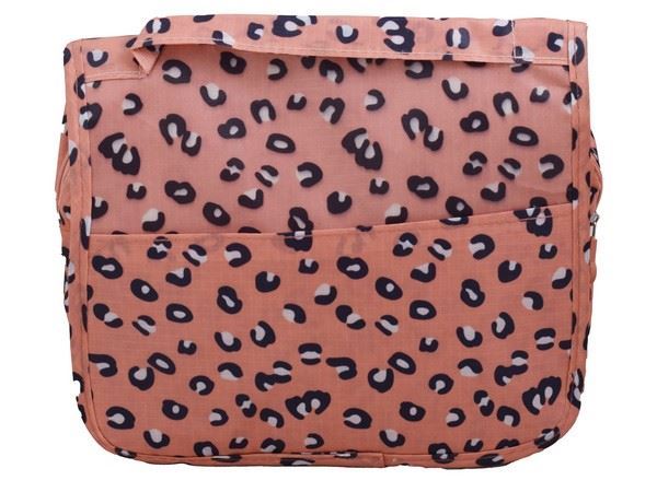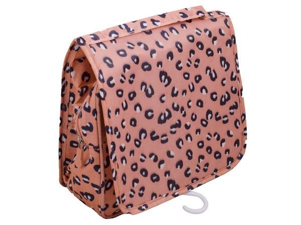 Velcro Hanging Toiletry Bag (Animal Print) Includes Main Zip Compartment, Front Zip Pouch, Inner Zip Pouch, Inner Transparent Pouch, 4 Inner Pockets and back Pocket. Velcro close. Includes hook to hang open. With Carry Handle Colour(s):Pink Material:210D Polyester Size:24 (w) x 19 (h) x 8.5 (d) - closed Unbranded only
