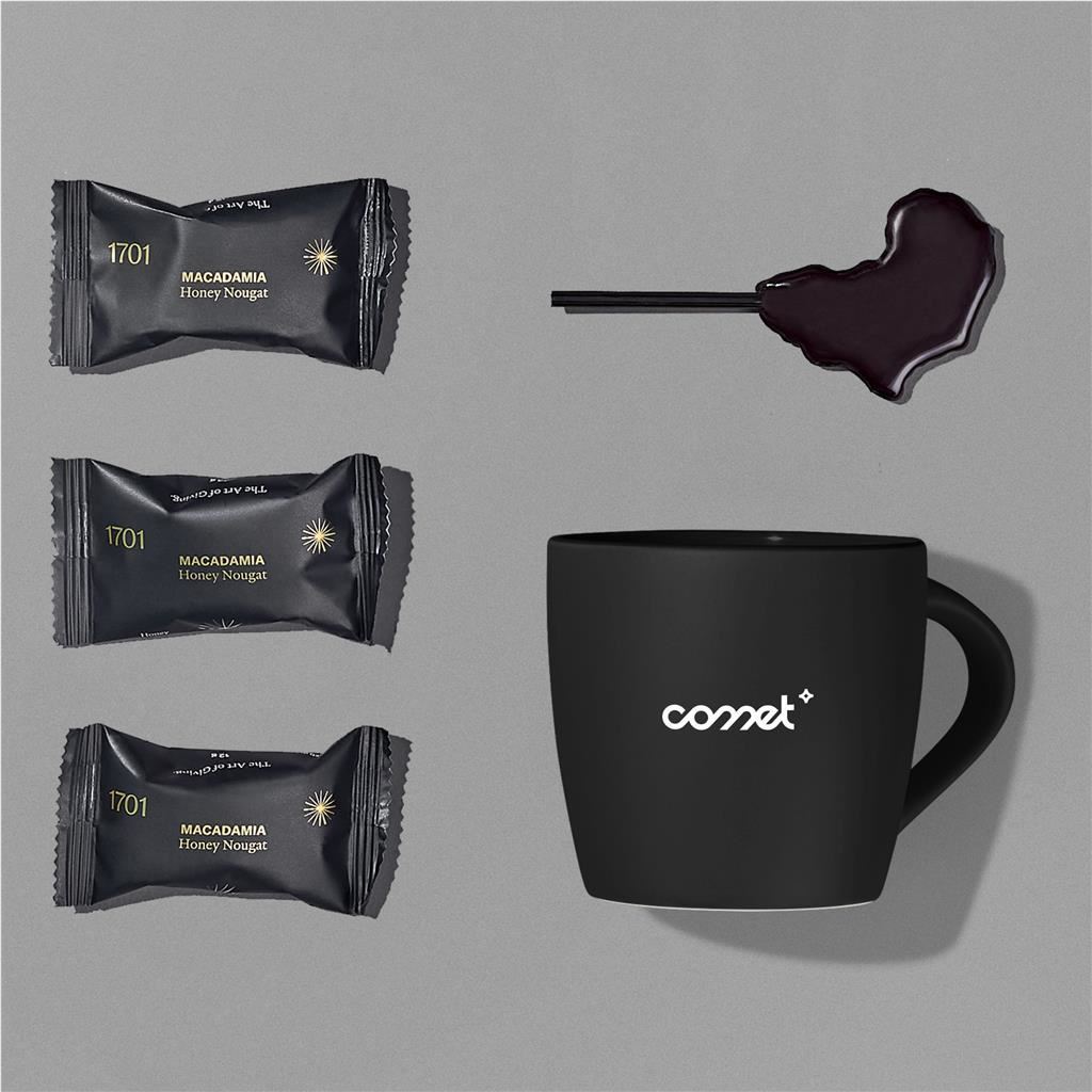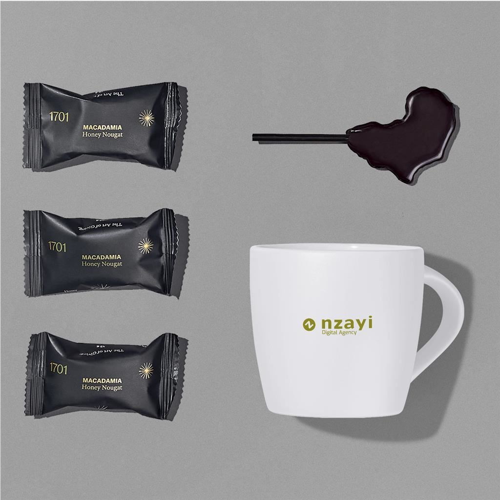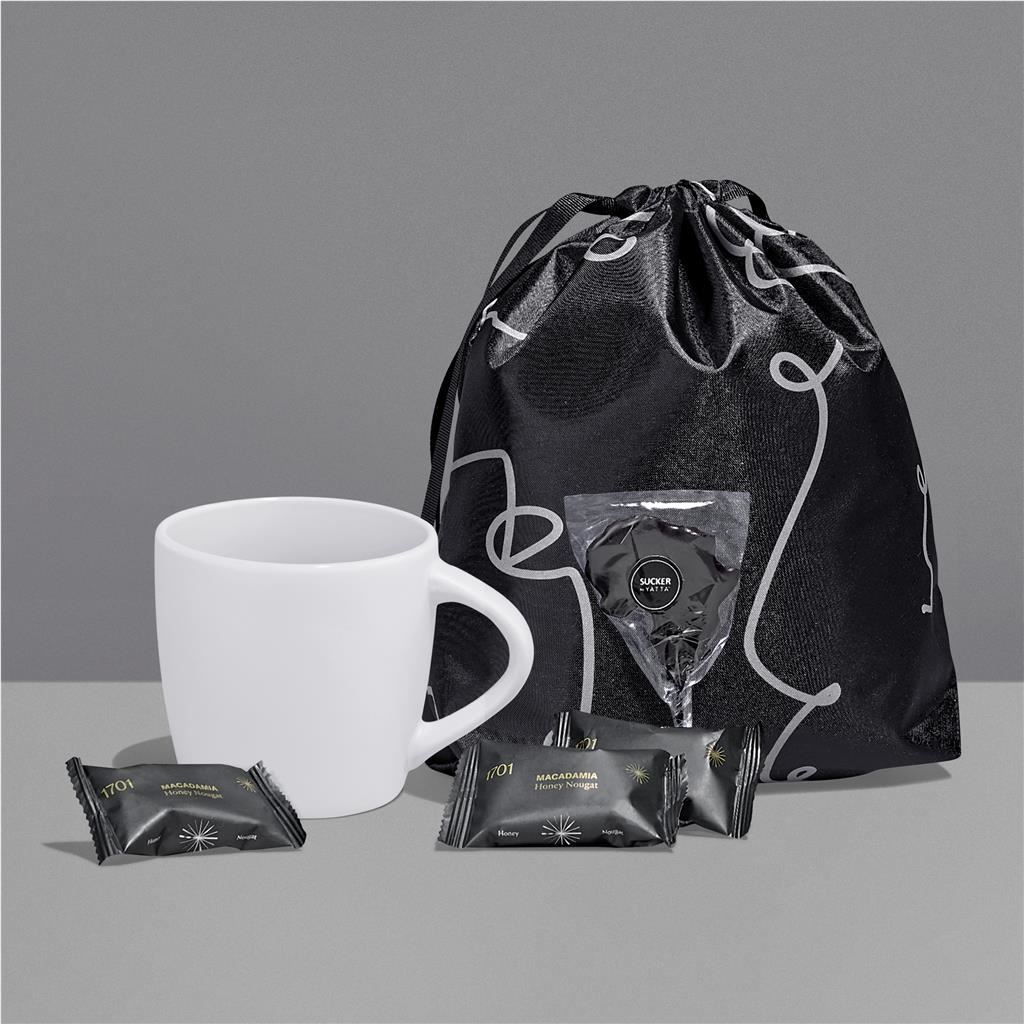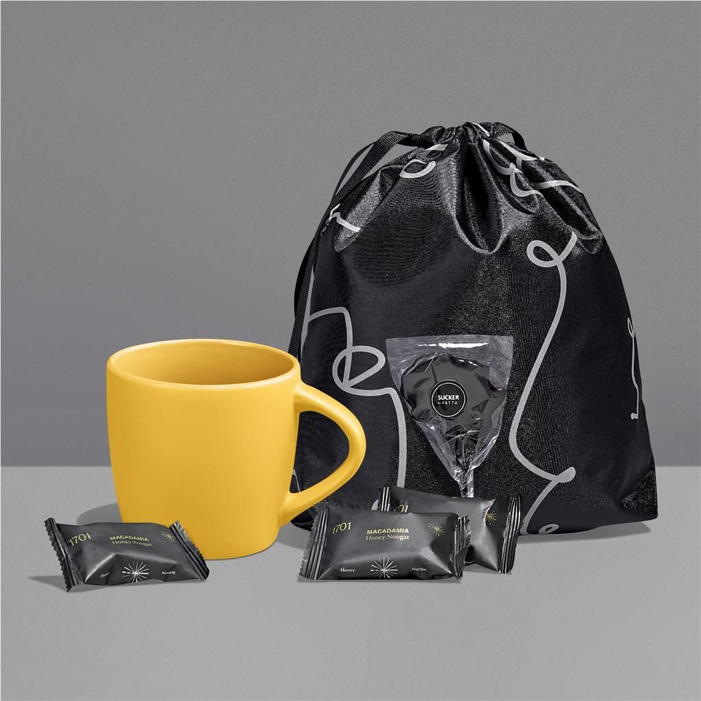 Brighten someone’s day with the Bright Bites Hamper. This charming yet impactful gift set includes a stylish mug available in a variety of vibrant colour options, paired with delicious mini nougat treats to enjoy throughout the day. A simple reminder that little moments of sweetness can make the biggest difference. The Yatta range of hampers is expertly crafted to provide a delightful experience with a curated selection of premium items and edible treats. This hamper is elegantly presented in a Yatta drawstring bag.