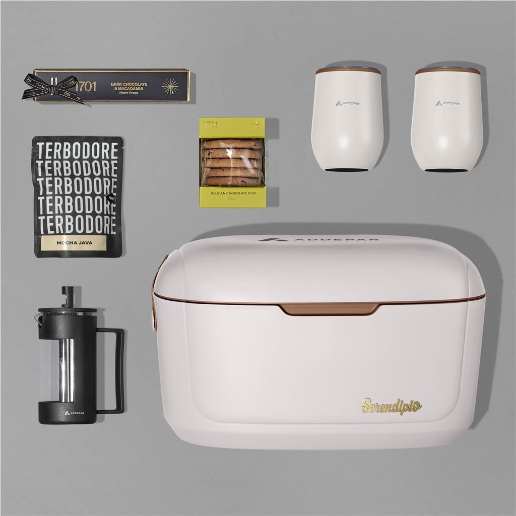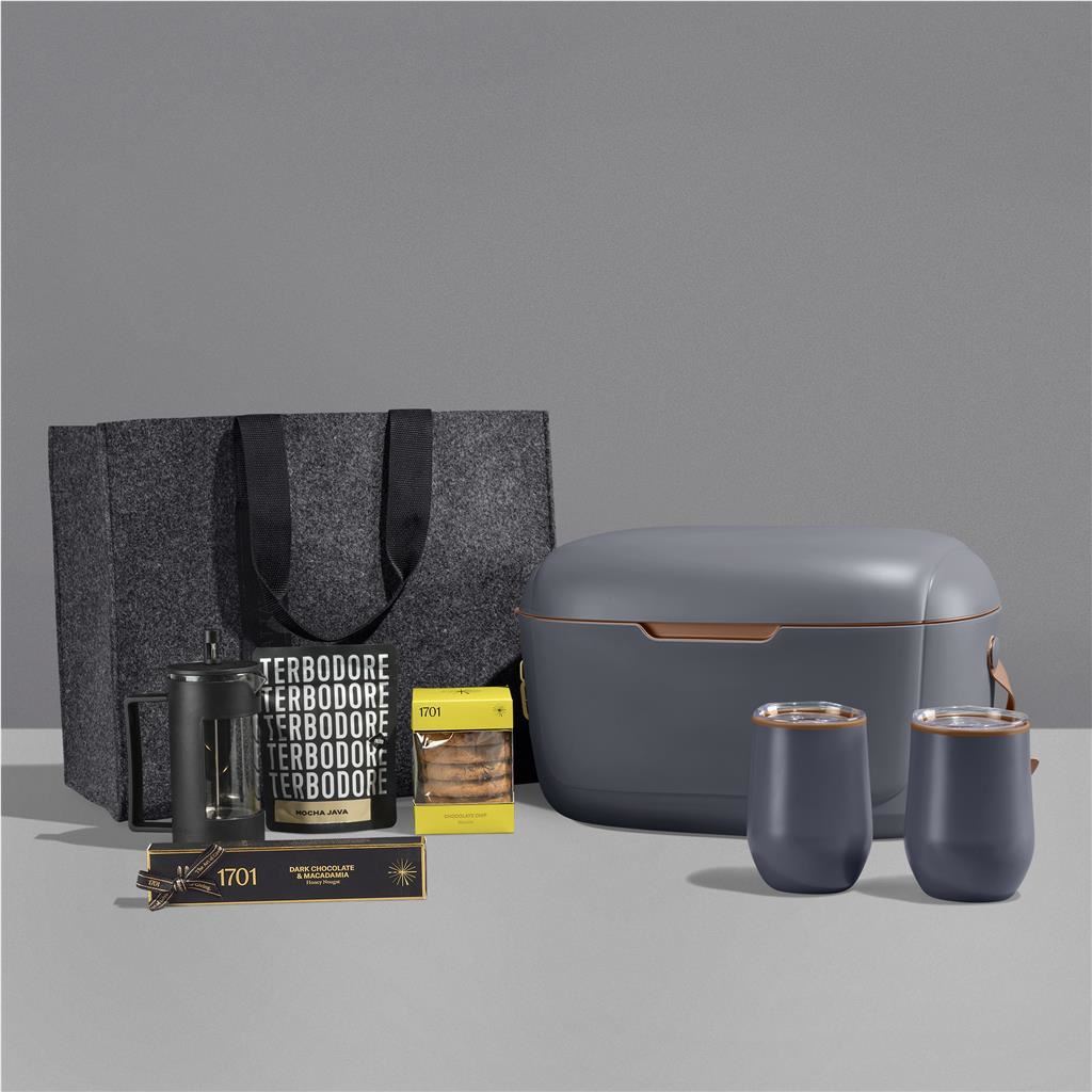 Yatta Cuppa Charm Hamper Brew up moments of pure charm with the Cuppa Charm hamper – a sophisticated gift set designed for coffee lovers and relaxed indulgence. Whether for a cozy gathering, a thoughtful gift, or a moment of self-care, this hamper blends elegance, flavour, and function in every detail. The Yatta range of hampers is expertly crafted to provide a delightful experience with a curated selection of premium items. Elegantly presented in a luxury 12-Litre Cooler Box. This hamper is further encased in a large size durable Dark Grey RPET felt gift bag. Felt bag size: 40 ( l ) x 20 ( w ) x 33 ( h ) cm The hamper contains: Serendipio Marina 12-Litre Cooler Box (GP-SD-35-B) 2 x Serendipio Ovolo Double-Wall Tumbler – 350ml (DR-SD-300-B) Serendipio Sonatina 5W Bluetooth Speaker (MT-SD-497-B) Serendipio Monocle Coffee Plunger – 350ml (HL-SD-145-B) 1701 100g Nougat Bar 1701 200g Biscuits Terbadore Coffee