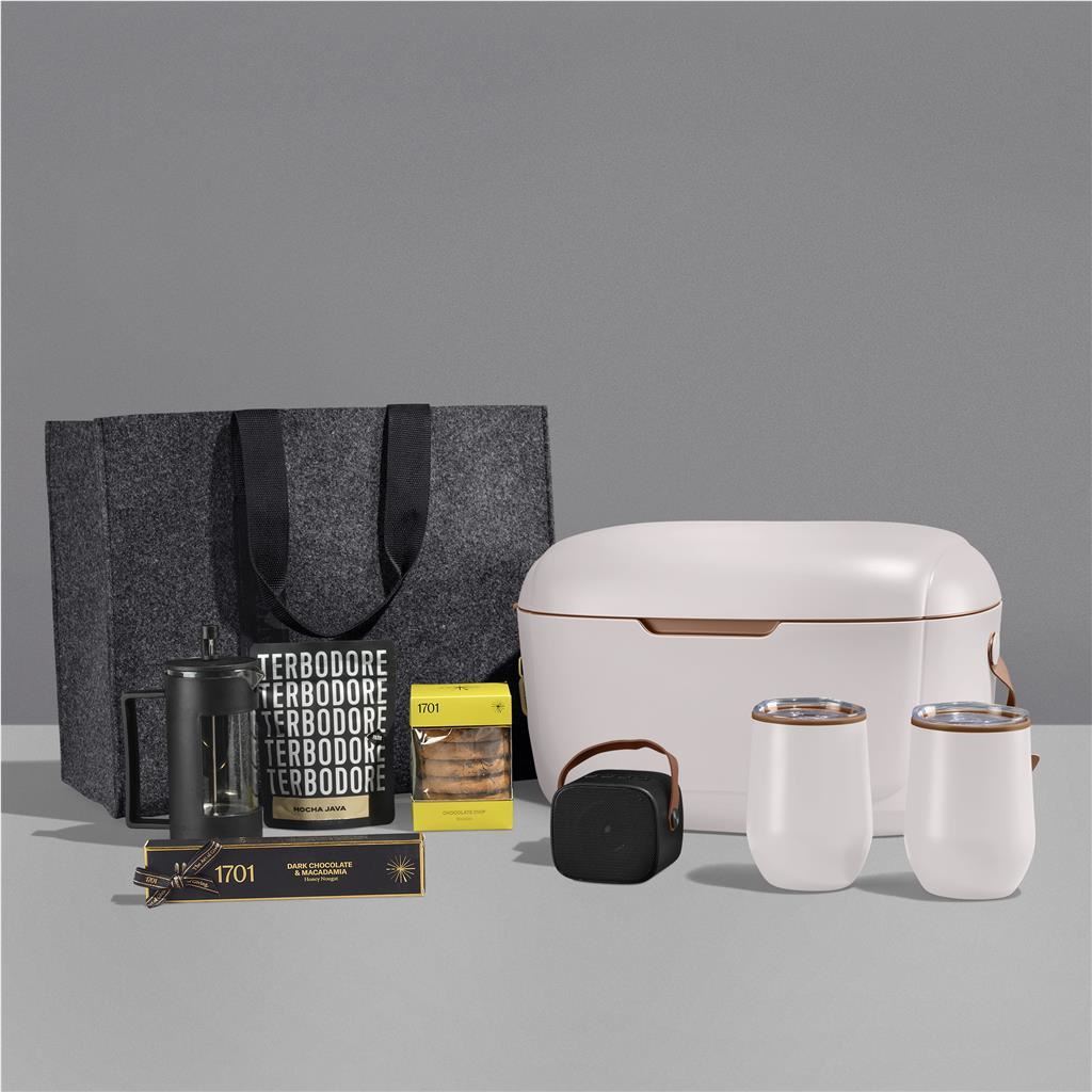 The Yatta range of hampers is expertly crafted to provide a delightful experience with a curated selection of premium items. Elegantly presented in a luxury 12-Litre Cooler Box. This hamper is further encased in a large size durable Dark Grey RPET felt gift bag.