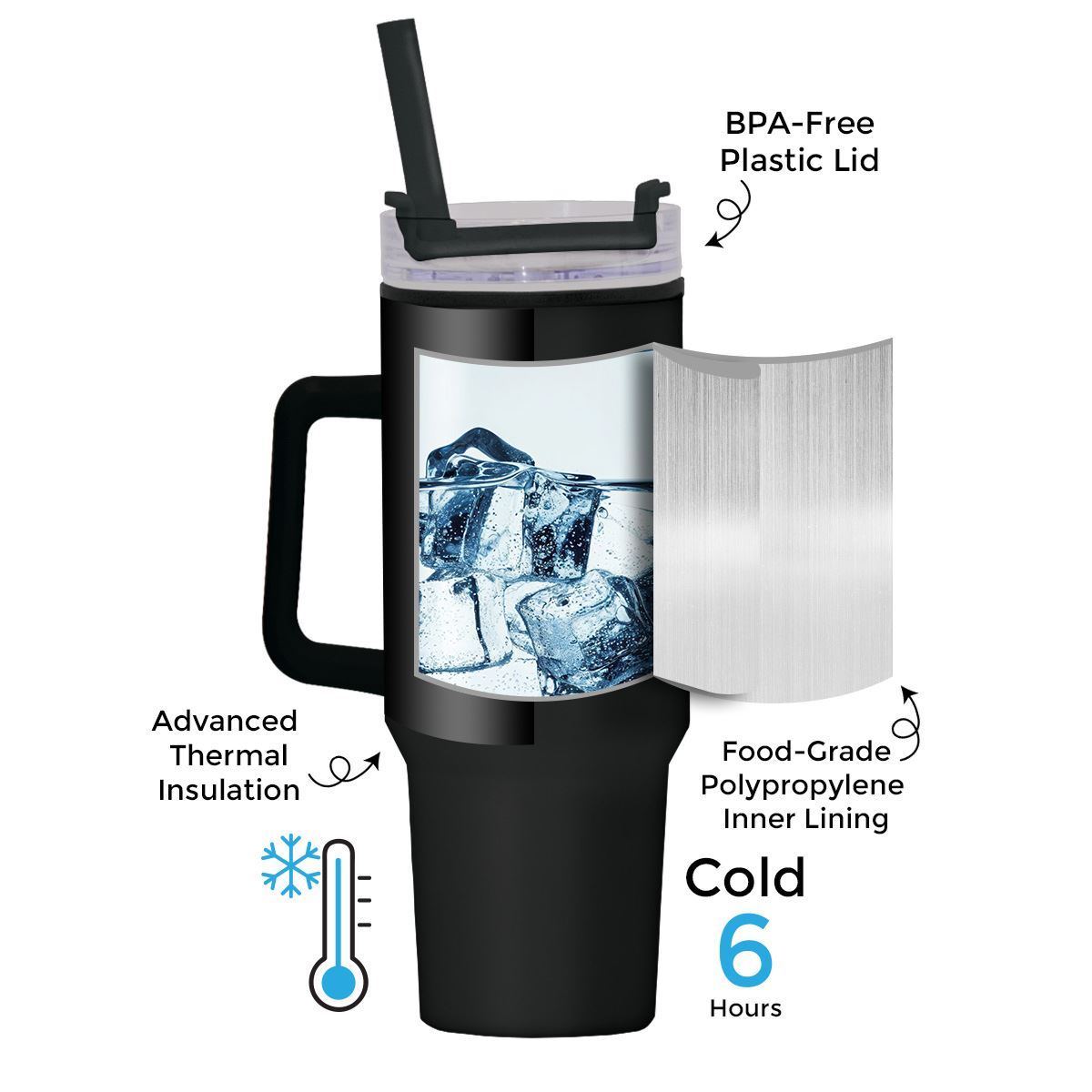 The Polypropylene Enduro Mug is expertly crafted from high-quality, durable stainless steel and polypropylene and boasts a generous 1200ml capacity. It features thermal insulation to keep your beverages cold for up to 6 hours. Built for comfort and convenience, the Enduro Mug includes a comfortable grip and the non-slip bottom ensures stability. Additionally, the mug's cup holder-friendly design ensures it fits securely in most car cup holders. The versatile lid offers three drinking positions: a sip option, a high-quality straw for refreshing cold beverages, and a drink mouthpiece that enhances your experience. The third position is a seal function, allowing you to securely close the lid between sips. The mug is elegantly packaged in a kraft box.