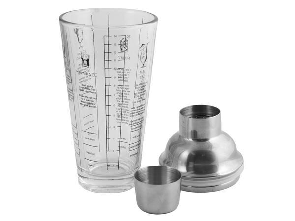 400ml Glass Cocktail Shaker Features printed measurements and classic drink recipes like Mai Tai, Long Island Ice Tea, Mojito, Sex on the Beach, White Russian and Kamikaze directly on the surface for easy mixing. Perfect for home bartenders and party hosts.no recipe book needed. Colour(s):Transparent & SilverMaterial: Glass & 201 Stainless Steel Lid Size:8.5 (w) x 22 (h) x 6 (d)