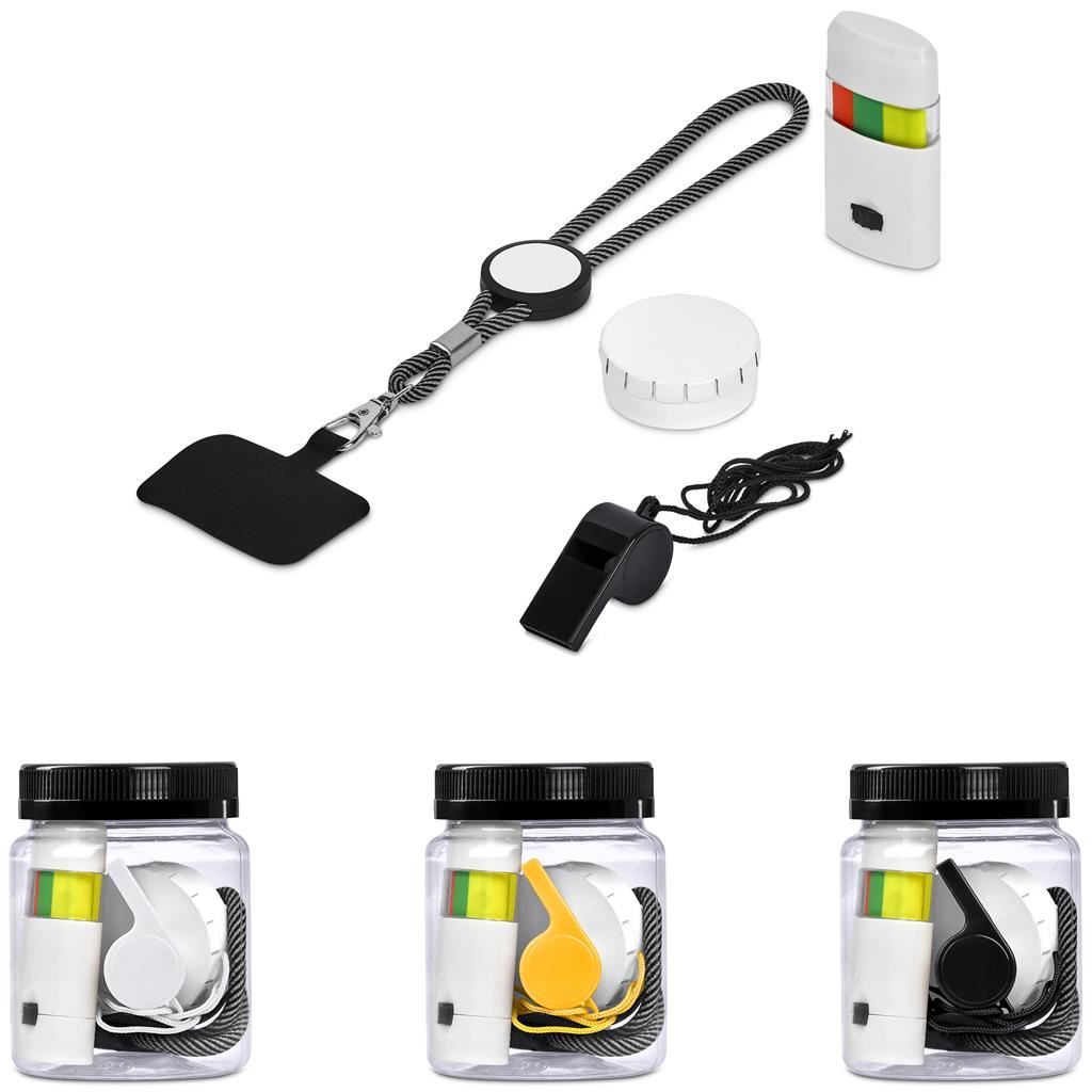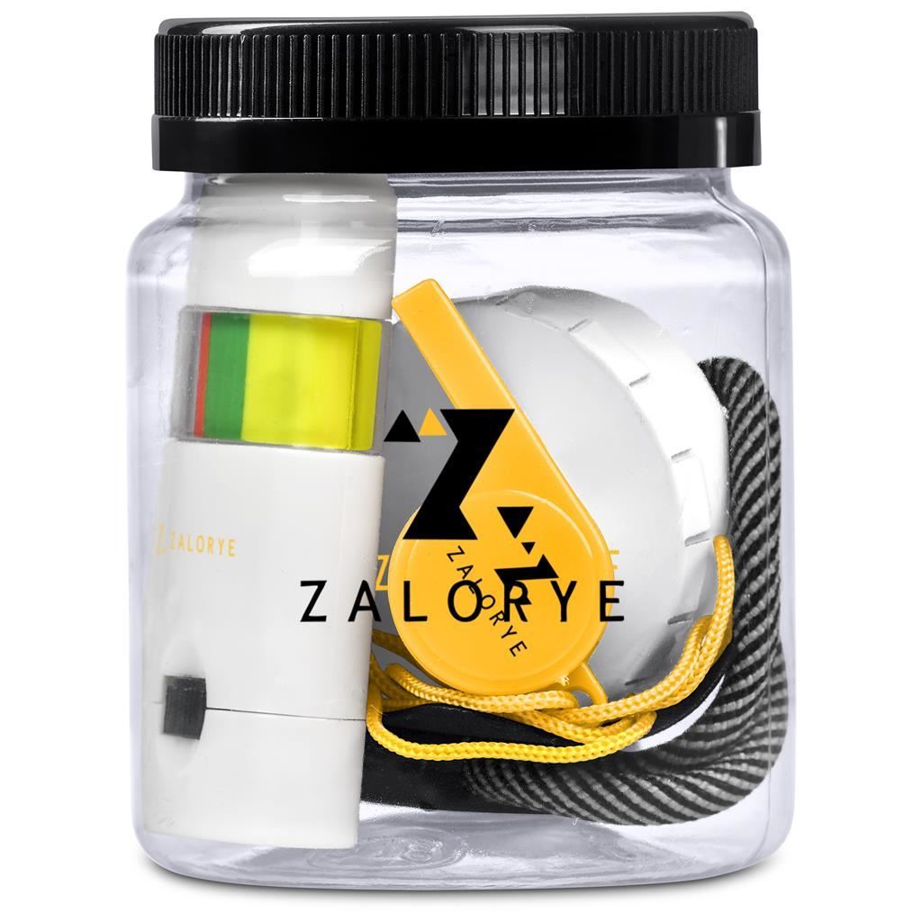 Altitude Ruma Gift Jar A compact, ready-to-gift jar set, filled with a mix of small promotional products. These jars are ideal for desk drops, giveaways, and creating small but memorable brand experiences. The jar contains: Altitude Blowout Whistle 4.2 ( l ) x 1.8 ( w ) x 2.3 ( h ) cm plastic & string matching cord attachment Clic-Clac Mints a great peppermint-flavored inexpensive giveaway your logo will look great with a full colour sticker on the lid Altitude Strukt Dome Wrist Phone Strap polyester, plastic & microfibre strap: 20 ( l ) cm adjustment disc: 3.2 ( d ) cm polyester round cord metal hook with phone patch Altitude Festiva Face Paint 7.5 ( l ) x 4 ( w ) cm plastic & skin-friendly face paint 3 bright lumo colours: orange, green, and yellow. water-washable formula - removes easily with soap and water. skin-friendly - gentle formulation suitable for most skins compact design - suitable for easy storage and transport Jar: 9 ( h ) x 6 ( d ) cm plastic bulk packed