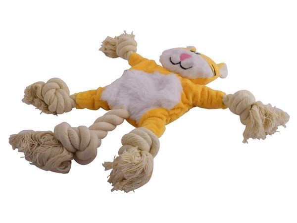 Dog Rope Chew Toy (Tiger) Bring out your dogs wild side with this fun tiger rope chew toy. Designed with a variety of textures and interactive features, this toy is perfect for engaging your furry friend during playtime. The soft, plush tiger body is ideal for cuddling, while the sturdy knotted rope arms and legs offer hours of tugging and chewing enjoyment,while also helping to promote healthy teeth and gums. Your dog will be delighted by the crinkling sound from the tigers tummy, adding an extra layer of sensory stimulation. For even more excitement, the tigers head contains a squeaker that will grab your dogs attention every time its pressed Branding Methods: Cannot be branded Colour(s):Yellow Material:Plush Size:18 (w) x 26 (h)