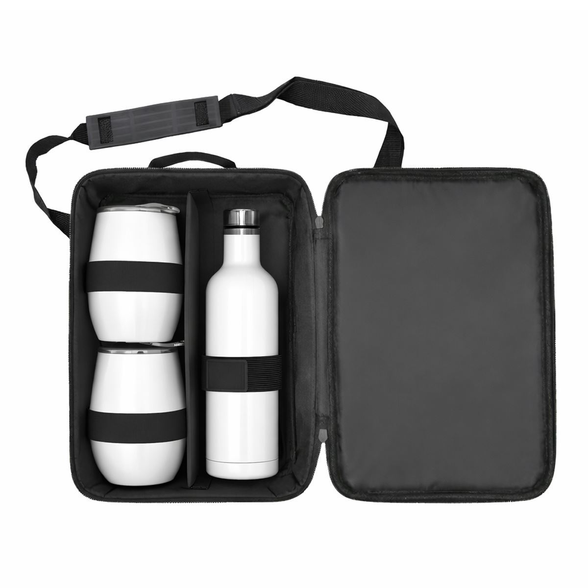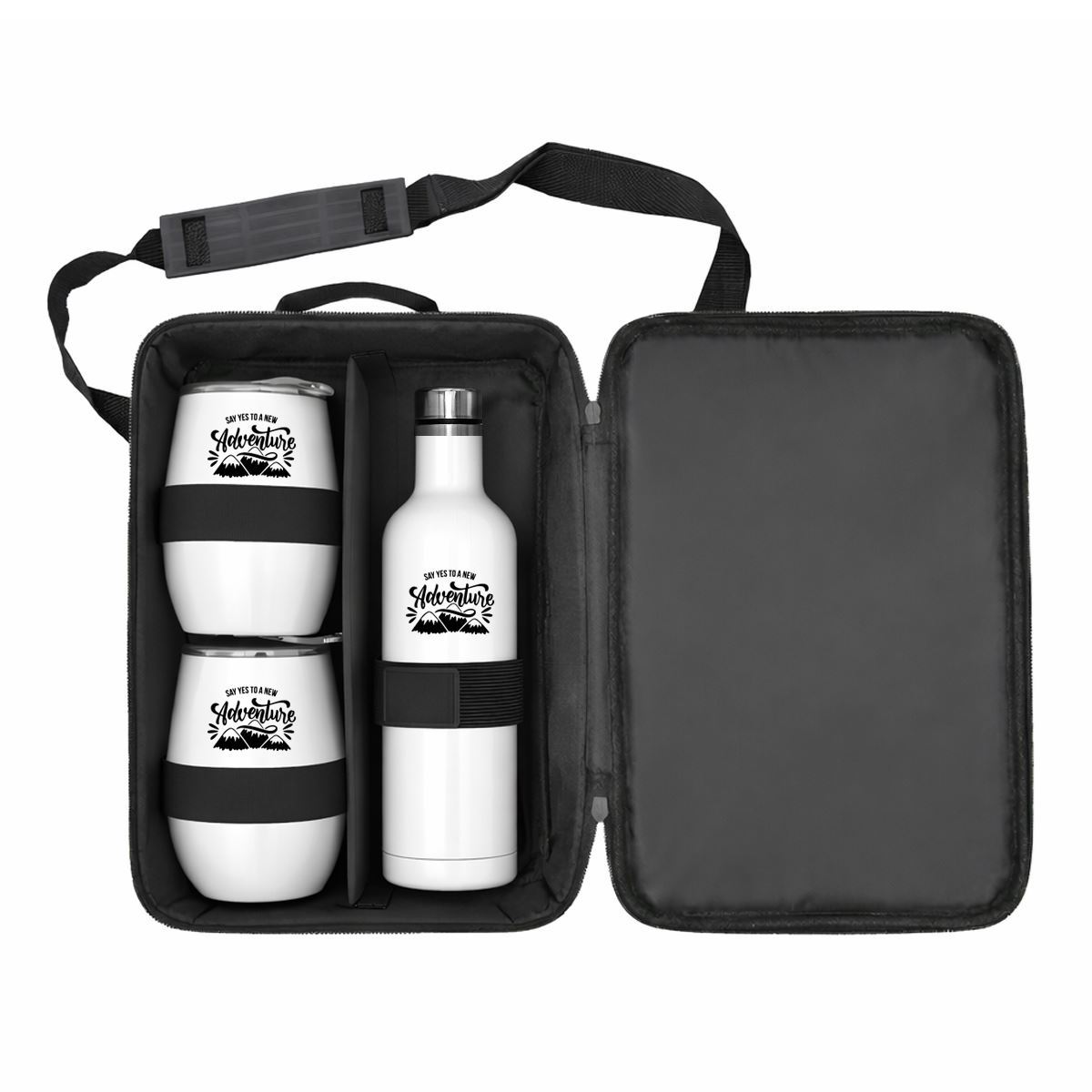 Executive Travel Drinkware Set Code: FLSKSET26314 A premium drinkware set designed for executive gifting, travel convenience and elevated brand visibility. Product features: 500ml Stainless Steel Flask: Durable flask designed for reliable temperature retention, offering a sleek and practical solution for on-the-go hydration Stemless Travel Mug (x2): Compact insulated mugs designed to keep beverages hot or cold, featuring practical travel lids for everyday use Reusable Carry Pouch: Presented in a protective pouch for secure storage, portability and premium gifting presentation Executive application: Ideal for corporate gifting, client engagement, travel kits and high-end promotional campaigns Care instructions: Not suitable for microwave or dishwasher use Specifications Stainless Steel, PP Plastic and Polyester Product Size: 30cm (W) x 38cm (H) x 12cm (D)