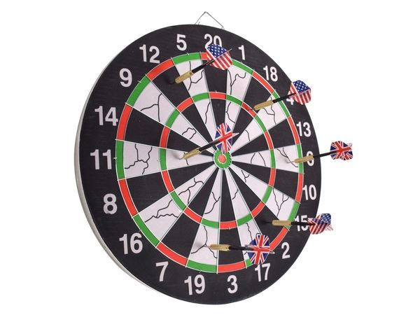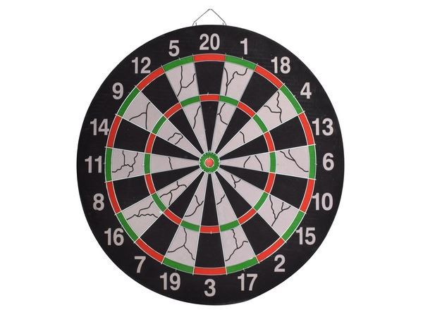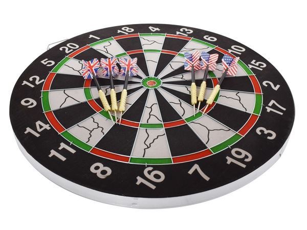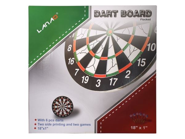 Flocked Pro Dart Board Enhance your game room, mancave, or pub with the Pro Dartboard. Includes 6 darts and is exact regulation dartboard size. Its easy to mount and fits perfectly on any wall. The double-sided design offers two different games, making it versatile for endless fun. The packaging provides general rules of Tournament and Target Bullseye dart games Colour(s):Black Material:Metal & Foam Size:46 (w) x 46 (h) x 3 (d) Packaging:Picture Box