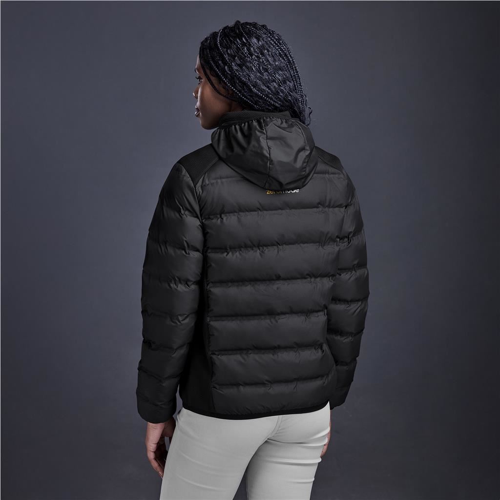 knitted fabric collar with concealed hood and sealed zip with branded zip puller