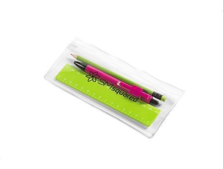 The perfect affordable clear maxi pouch great for that Back to School campaign. Excludes contents . . Can fit a slim pen, pencil, 15cm ruler , eraser and sharpener• PVC: 19 ( l ) x 7.8 ( w ). This item is only sold with accompanying pens from Amrod as this item is not a stand alone product.