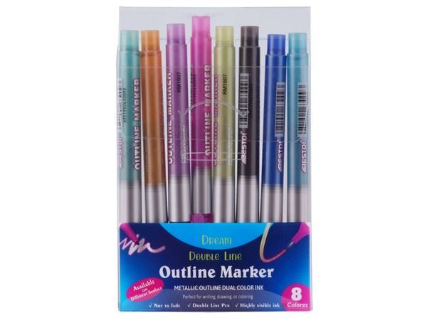 Metallic 8-Piece Outline Marker Spark a burst of creativity with the Metallic 8-Piece Outline Marker set, featuring silver-based dual-line markers in the most popular colours for dazzling effects on greeting cards, Christmas cards, rock paintings etc. to allow your artistic vision to flow. Shake the markers first with tip facing up to mix the ink and then press the marker tip onto paper a few times to pump the ink out Colour(s):Assorted Material:size Size:13.5 (l) x 9.5 (w) x 1.2 (d) Packaging:PVC Pack Unbranded only