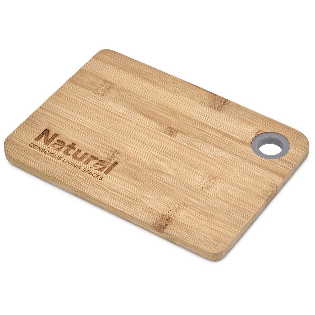A versatile bamboo board designed for both food preparation and serving. Made from durable, sustainable bamboo, it features a circular thumb opening with a soft silicone ring for comfortable carrying and easy handling. Ideal for chopping, plating snacks, or casual entertaining.