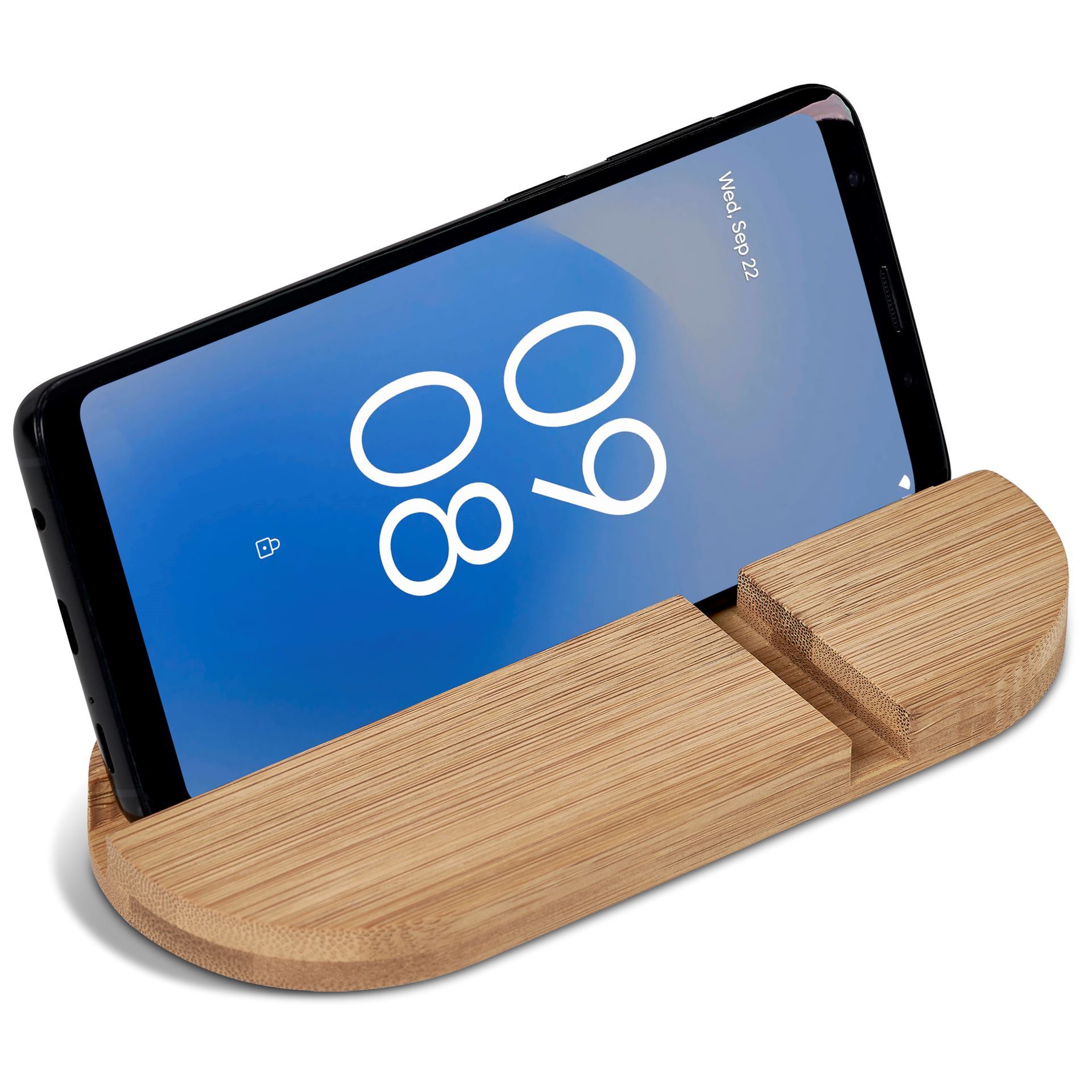 Simple, clean design and natural bamboo material make this phone holder an ideal choice for a desktop promotion.