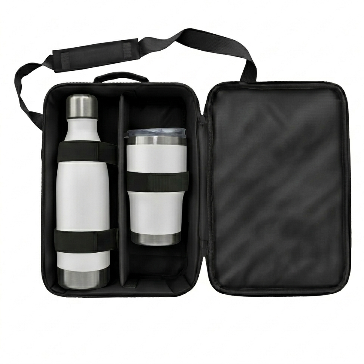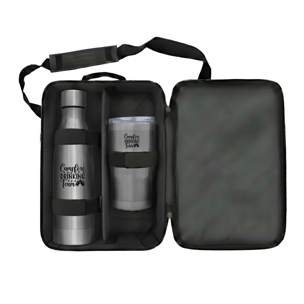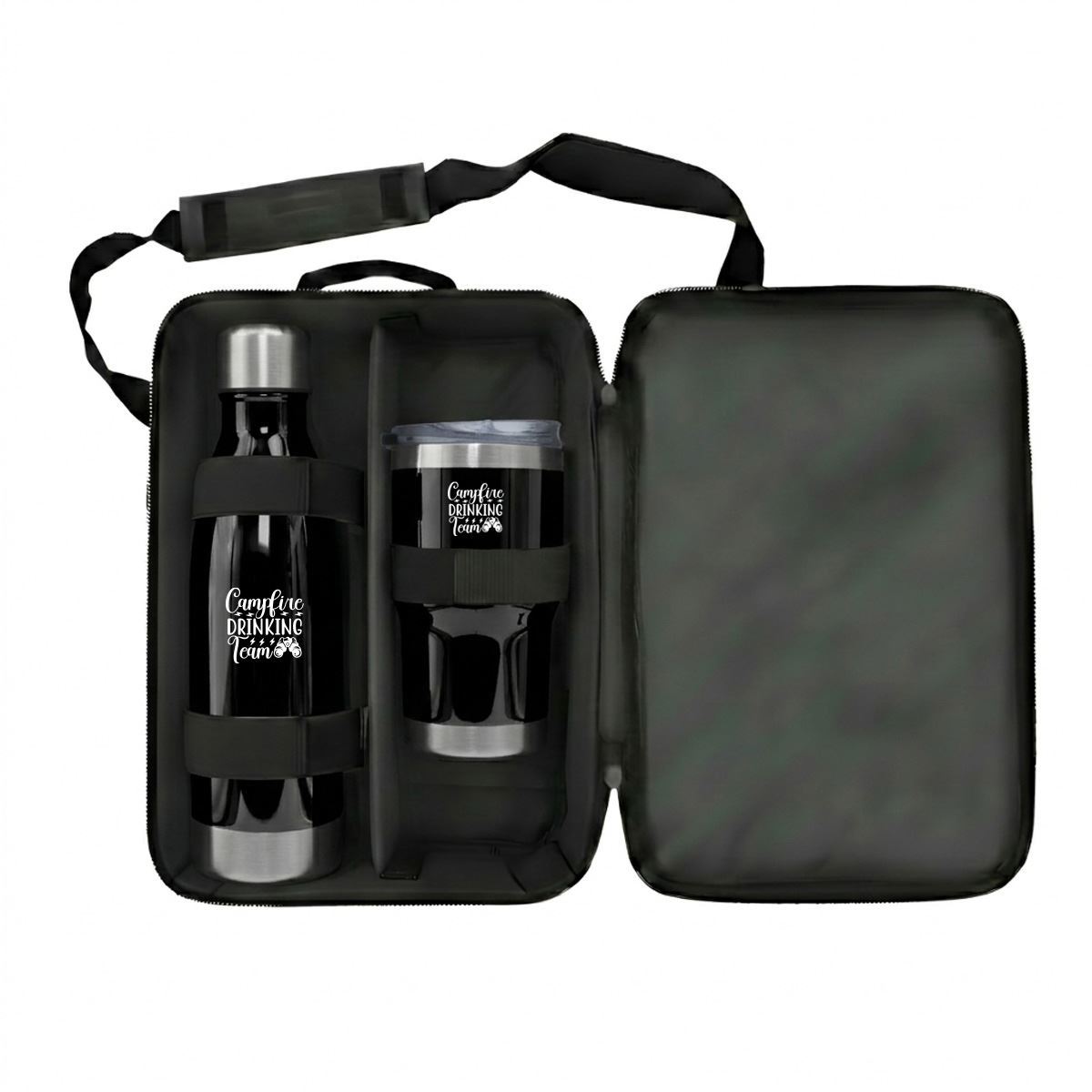 Premier Bottle & Tumbler Set Code: FLSKSET26315 A premium drinkware set designed for executive gifting, modern travel and elevated brand visibility. Product features: Luray 500ml Flask: Stainless steel flask designed for reliable temperature retention, offering a sleek and durable solution for everyday use Insulated Tumbler: Modern tumbler designed to keep beverages hot or cold, with a secure lid for convenient on-the-go use Reusable Carry Pouch: Presented in a protective pouch for secure storage, portability and premium gifting presentation Executive application: Ideal for corporate gifting, client engagement, travel kits and high-end promotional campaigns Care instructions: Not suitable for microwave or dishwasher use Specifications Stainless Steel, PP Plastic and Polyester Product Size: 30cm (W) x 38cm (H) x 12cm (D)