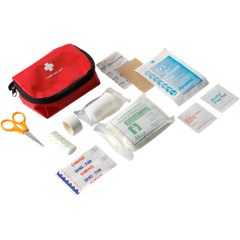 40 Piece car emergency first aid kit: 15 Plasters, 8 alcohol prep-pads, 2 safety pins, a pair of scissors, 2 PBT bandages, 1 triangle bandage, 1 non-woven tape, 2 pads, 2 cleansing wipes, 2 antiseptic wipes, 1 safety vest, 1 safety blanket, 1 emergency dy