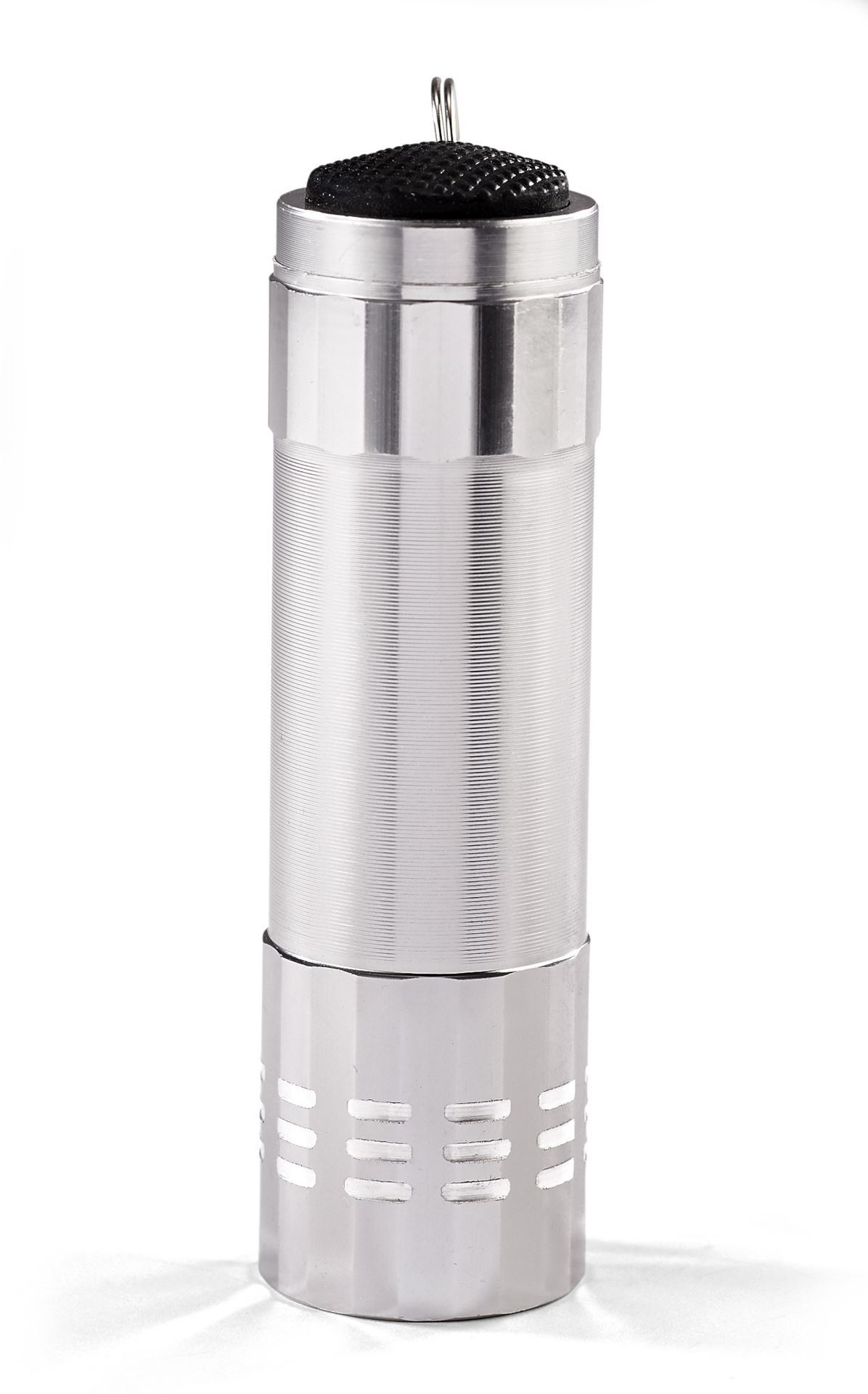 Resilient Torch. FREE 1 Position Laser Engraving. Size torch: 8.2 ( l ) x 2.4 ( dia ) box: 10 ( l ) x 3 ( w ) x 3 ( h ) Material: aluminium 9 LED flashlights 3 x AAA batteries included