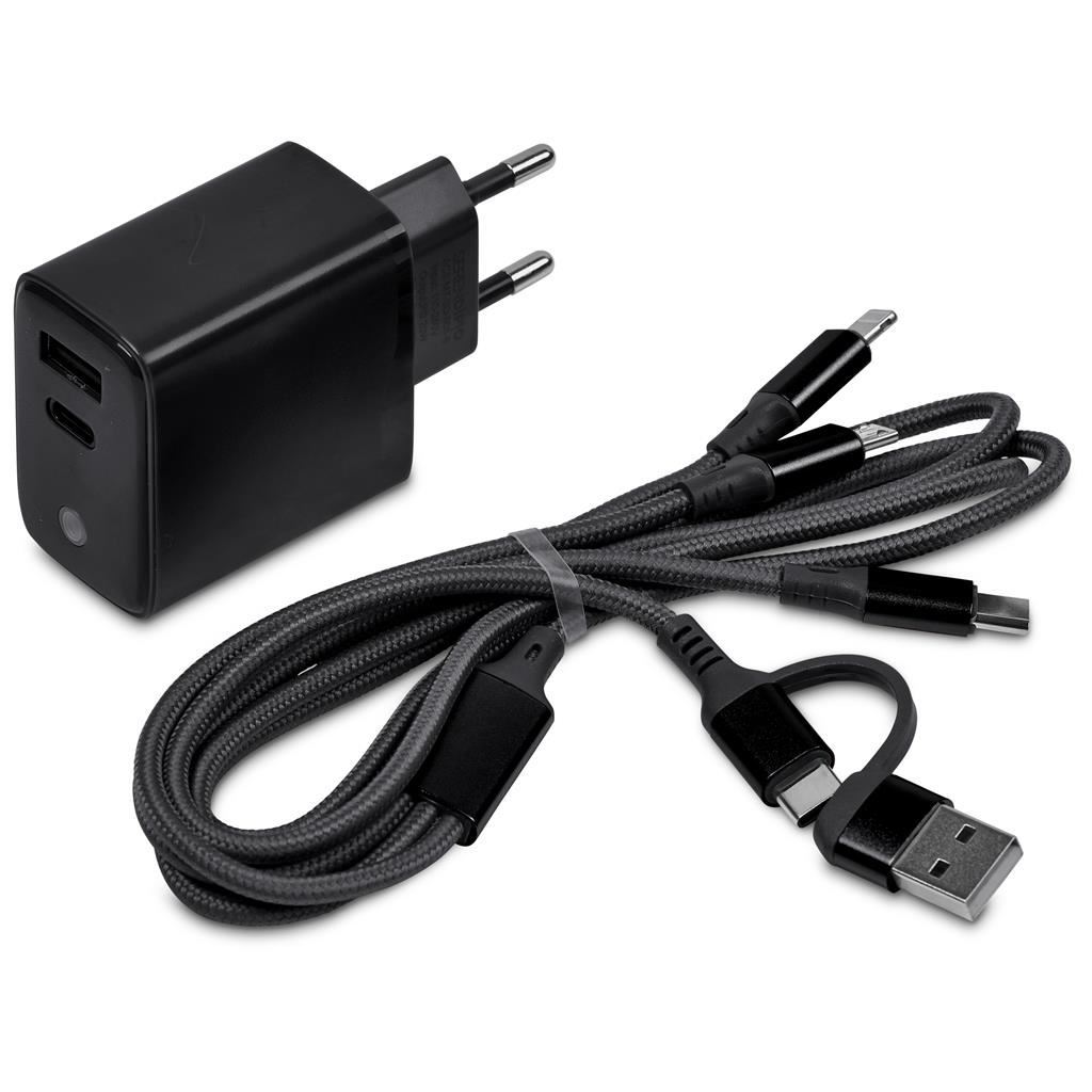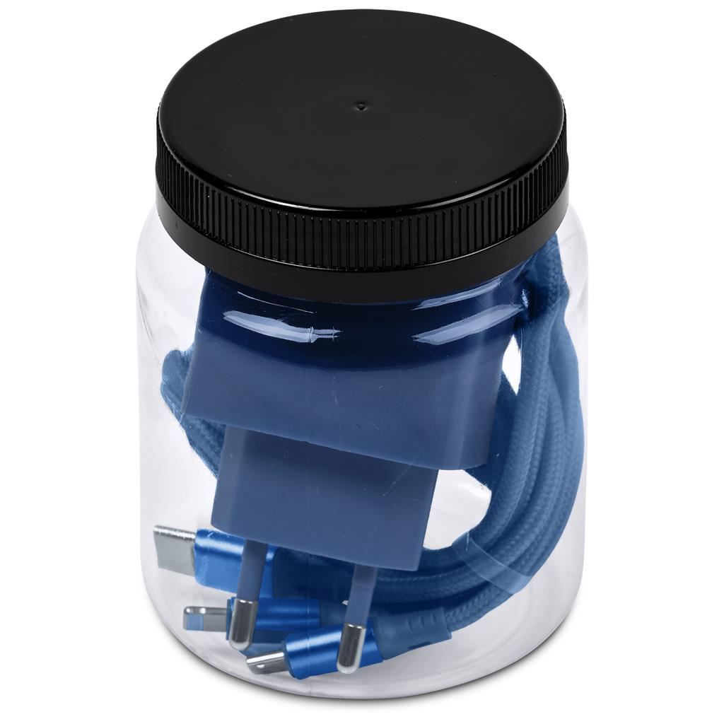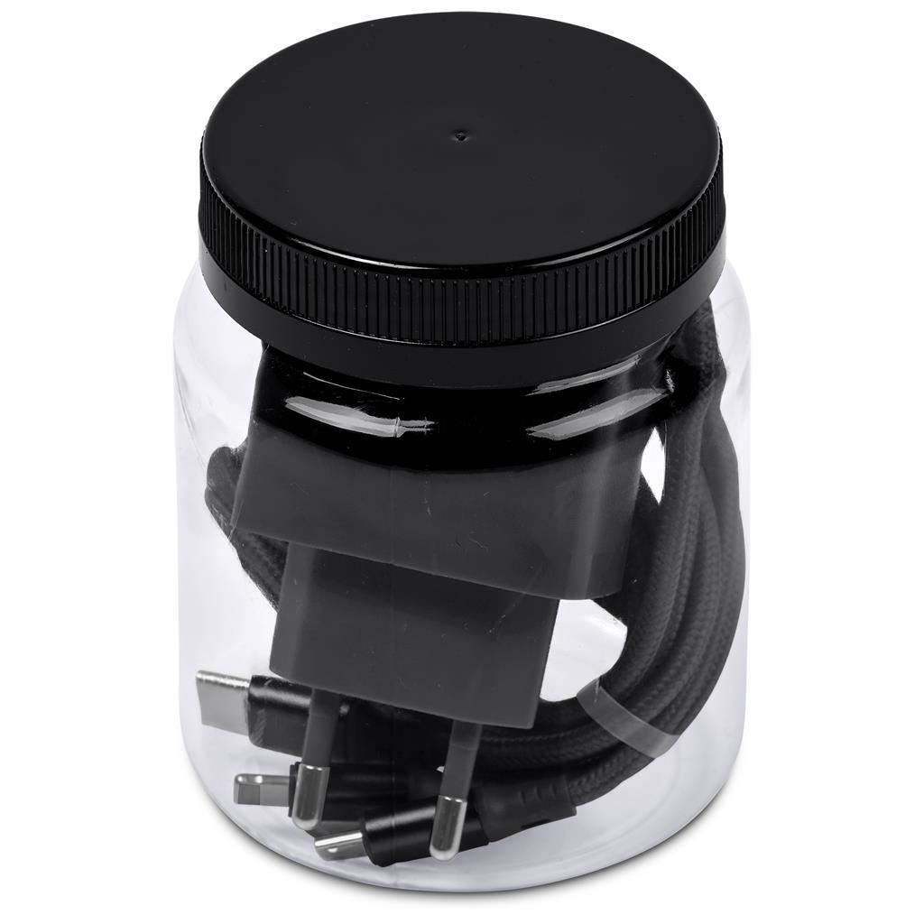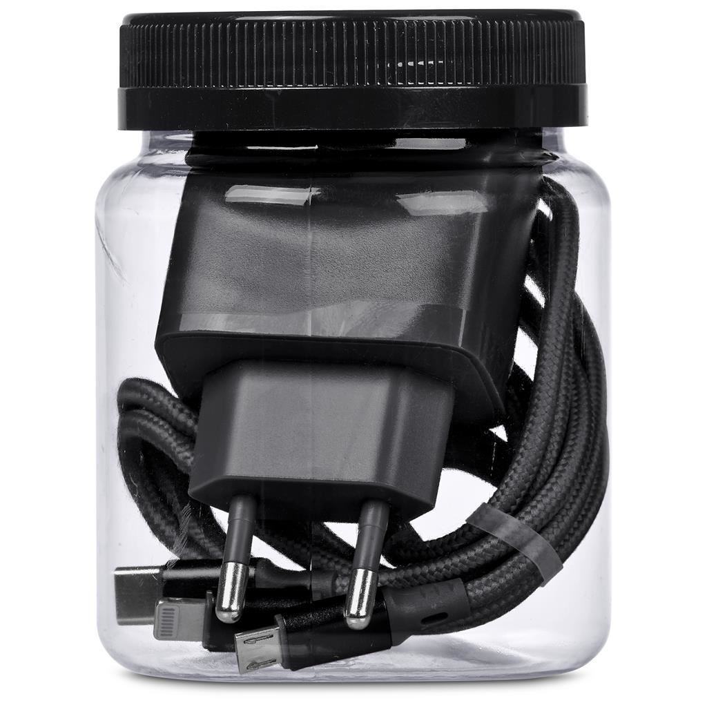 Serendipio Tenby Tech Set A matching fast wall charger and a fast-charge multi-cable are combined in a plastic jar that can be branded with a logo or message, making it a delightful and useful desk drop or promotional gift. Serendipio Berkshire Fast Wall Charger (MT-SD-505-B): 8.4 ( l ) x 4.7 ( w ) x 2.7 ( h ) cm plastic & steel 20W GAN adaptor with LED indicator input: 110 - 240V, 50/60 Hz, 1.0A max type-C output : 20W (max): 5V/3A, 9V/2.22A, 12V/1.67A USB-A output: 18W (max): 5V/3A, 9V/2A, 12V/1.5A part of a range of fashionable Serendipio technology products Serendipio Lancashire Fast Charge Multi-Cable (MT-SD-506-B): 120 ( l ) cm nylon & steel USB-A & Type-C connectors on one end and Type-C, Micro, and Lightning connectors on the other end. Type-C input to Type-C output: 60W (max): 20V/3A Type-C input to Lightning output: 10W (max): 5V/2A Type-C input to Micro output: 10W (max): 5V/2A USB-A input to Type-C output: 10W (max): 5V/2A USB-A input to Lightning output: 10W (max): 5V/2A USB-A input to Micro output: 10W (max): 5V/2A Jar: 9 ( h ) x 6 ( d ) cm plastic bulk packed
