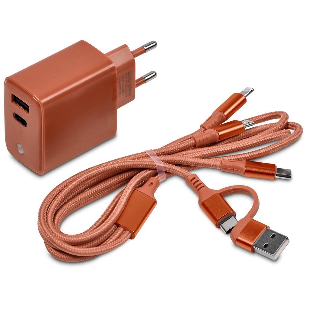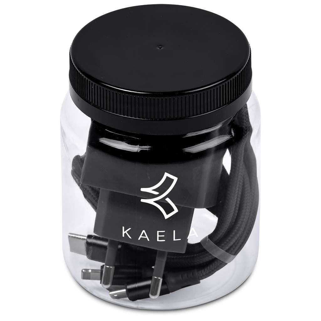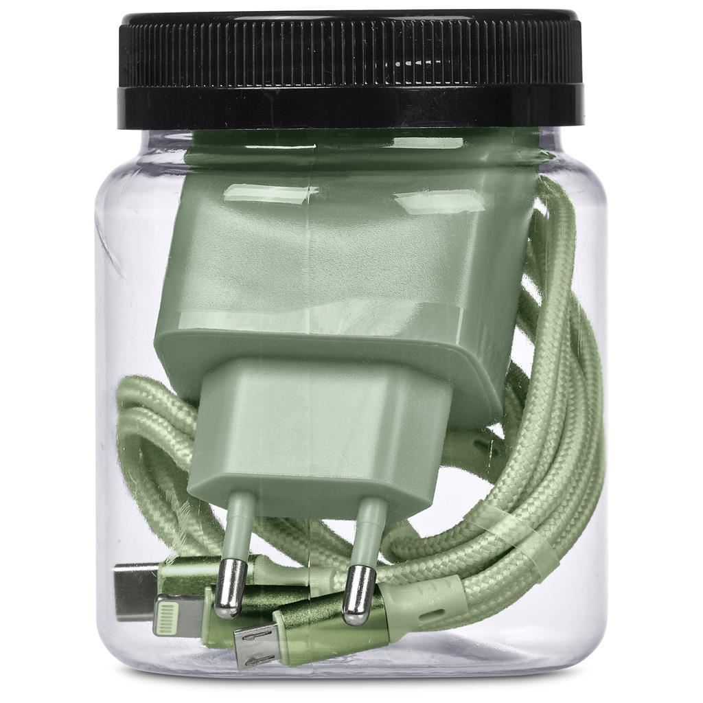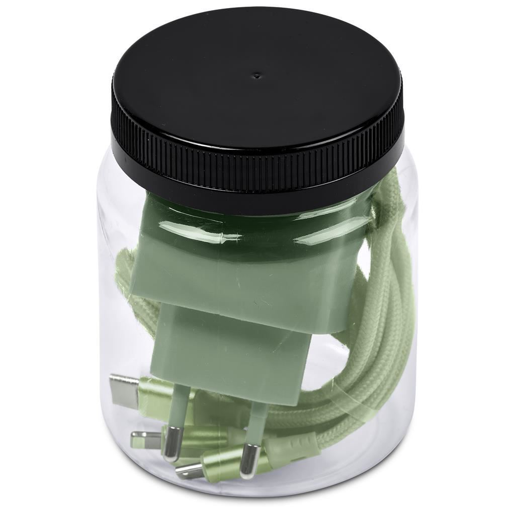 Serendipio Tenby Tech Set A matching fast wall charger and a fast-charge multi-cable are combined in a plastic jar that can be branded with a logo or message, making it a delightful and useful desk drop or promotional gift. Serendipio Berkshire Fast Wall Charger (MT-SD-505-B): 8.4 ( l ) x 4.7 ( w ) x 2.7 ( h ) cm plastic & steel 20W GAN adaptor with LED indicator input: 110 - 240V, 50/60 Hz, 1.0A max type-C output : 20W (max): 5V/3A, 9V/2.22A, 12V/1.67A USB-A output: 18W (max): 5V/3A, 9V/2A, 12V/1.5A part of a range of fashionable Serendipio technology products Serendipio Lancashire Fast Charge Multi-Cable (MT-SD-506-B): 120 ( l ) cm nylon & steel USB-A & Type-C connectors on one end and Type-C, Micro, and Lightning connectors on the other end. Type-C input to Type-C output: 60W (max): 20V/3A Type-C input to Lightning output: 10W (max): 5V/2A Type-C input to Micro output: 10W (max): 5V/2A USB-A input to Type-C output: 10W (max): 5V/2A USB-A input to Lightning output: 10W (max): 5V/2A USB-A input to Micro output: 10W (max): 5V/2A Jar: 9 ( h ) x 6 ( d ) cm plastic bulk packed