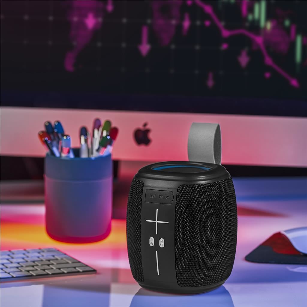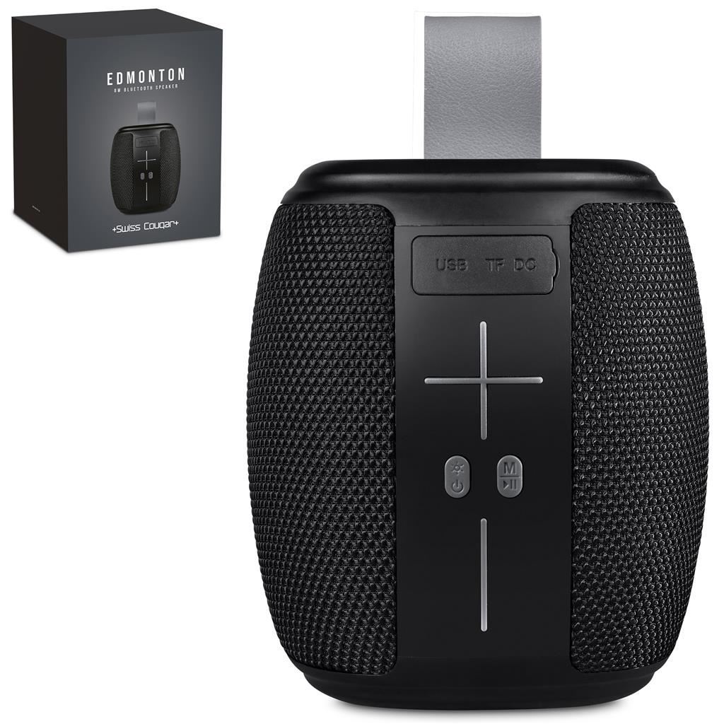 Swiss Cougar Edmonton 8W Bluetooth Speaker Bring your music to life with this Swiss Cougar 8W portable speaker that combines powerful, crystal-clear sound with vibrant lighting effects. Its compact design makes it easy to carry, while the built-in strap ensures it’s always ready to go when you are. Stylish, practical, and fun, this speaker is designed for anyone who loves sharing great music and good times. 11.4 ( l ) x 11.4 ( w ) x 13.1 ( h ) cm ABS & fabric Bluetooth version 5.4 JL6965E speaker power: 8W battery: 1200mAh audio playback time: approximately 4 – 5 hours functions: BT, TF, AUX, MIC, LED, FM IPX5 waterproof speaker RGB light with multiple lighting effects, including lights off portable hanging rope includes charging cable and user manual packaged in a Swiss Cougar gift box