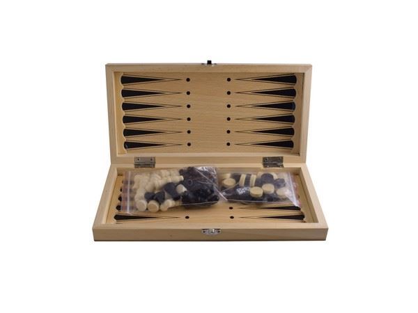 Travel 3-in-1 Game Set Includes Chess, Backgammon and Checkers. Hinges closed Colour(s):Brown & Natural Material:Bamboo Size:24 (l) x 12 (w) x 3.5 (d) - closed Packaging:Box