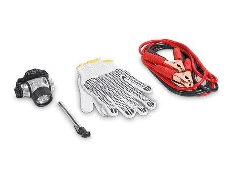US Basic Drive-Time Vehicle Emergency Kit This extremely handy Drivetime Vehicle Emergency Kit contains a booster cable (50A CCA), a tyre pressure gauge, a pair of safety gloves, a headlamp (batteries not included) and a rain poncho, all in a red hard shell case. hard shell case: 24 ( l ) x 14.5 ( w ) x 7.5 ( h ) EVA 1 x 50A CCA booster cable: 200 ( l ) 1 x tyre pressure gauge 1 x pair of safety gloves 1 x headlamp: 3 x AAA batteries ( not included) 1 x rain poncho (not shown)